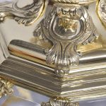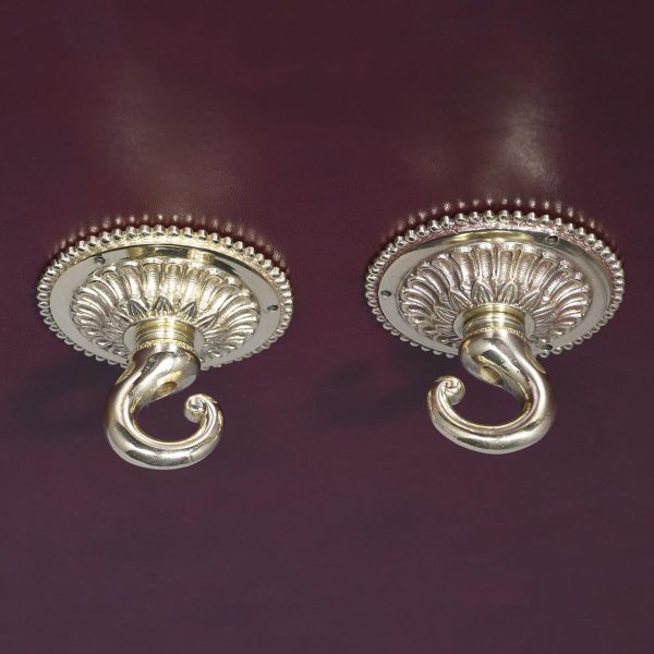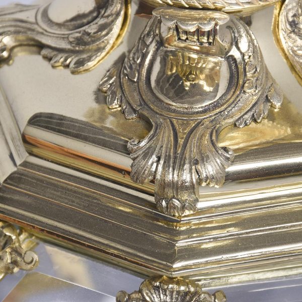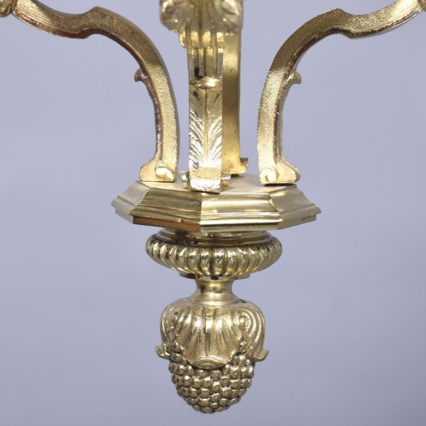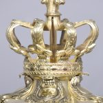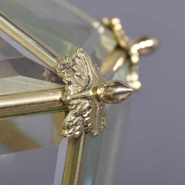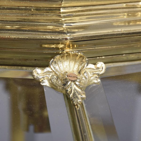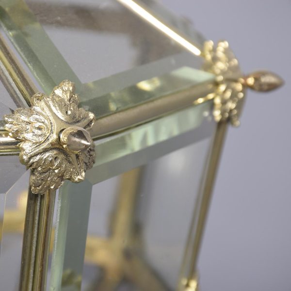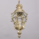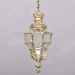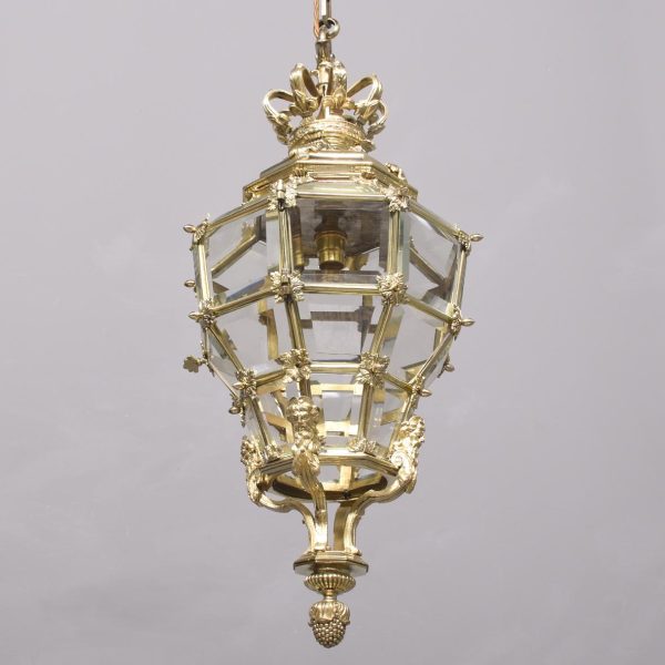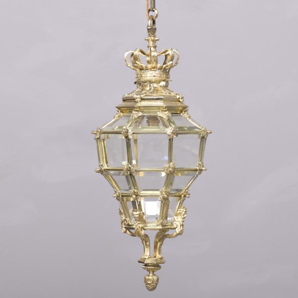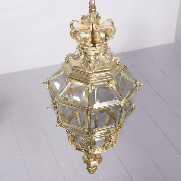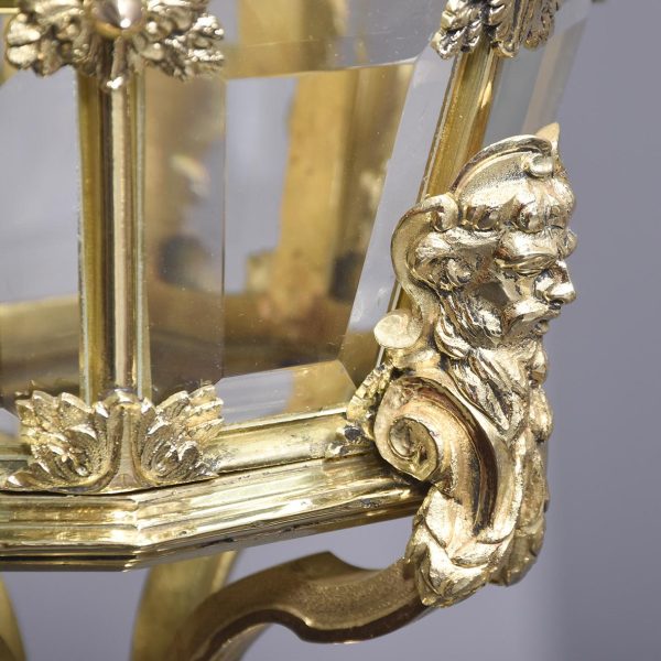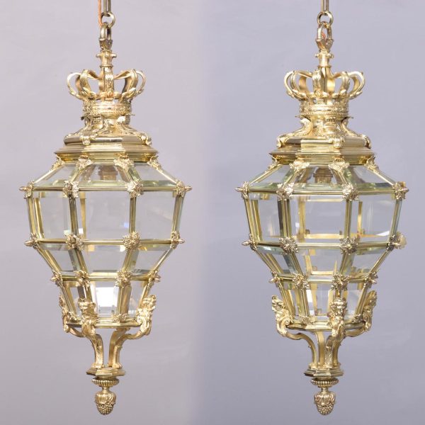 Circa 1890. A magnificent pair of ormolu lanterns of hexagonal form, surmounted by a pierced crown with shaped bevel glass concealing an access door, with the held in place by gilded square flower heads, the tapering body with 4 classical masks terminating on a down-facing finial. Includes chain and ceiling mount.