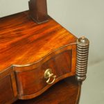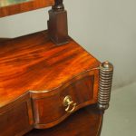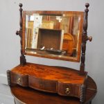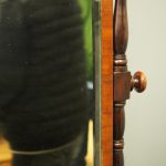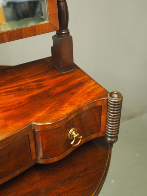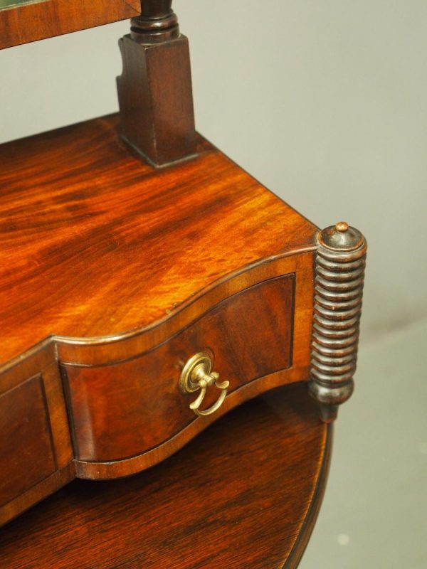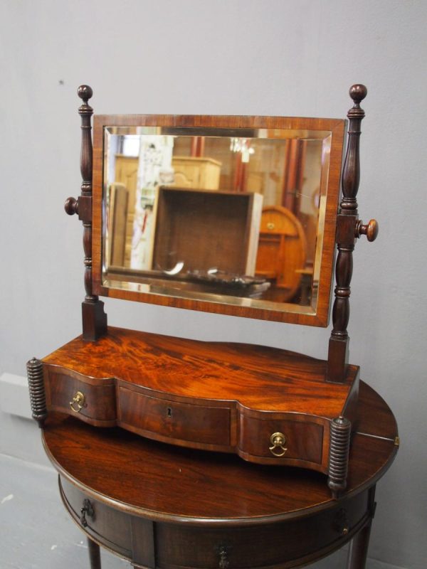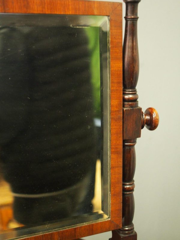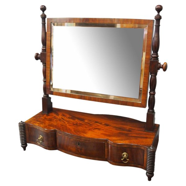 Circa 1830, large Scottish George IV mahogany dressing mirror with unusual design. The rectangular mirror plate with bevelled edges (in good condition) is within a neat cross banded frame. Supported on turned and block supports surmounted by finials. The shaped base in flame mahogany with 3 shape-front drawers 2 with brass handles and flanked by fluted columns over neat bun feet.