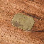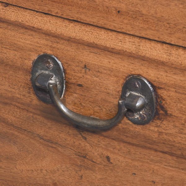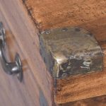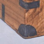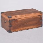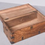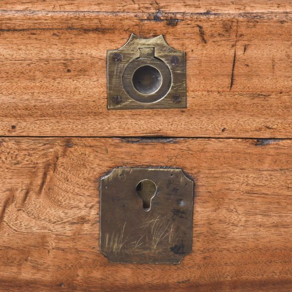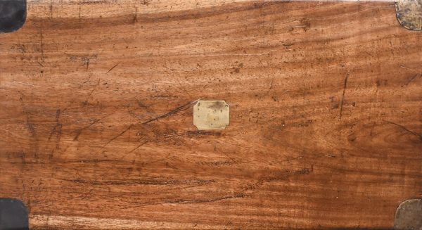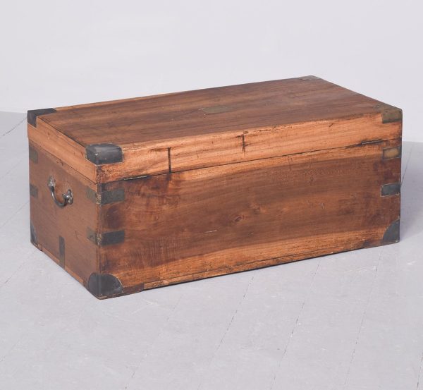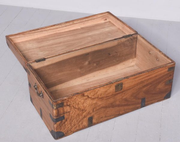 Circa 1860. Large solid camphorwood brass bound campaign trunk. The deep lid with brass corners and a central brass plaque and with an inset military style brass handle to the front. The trunk with multiple brass bandings and original cast brass carrying handles. In excellent condition.