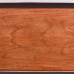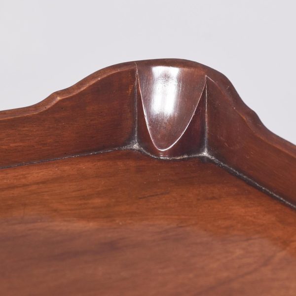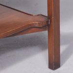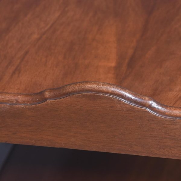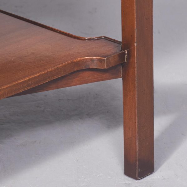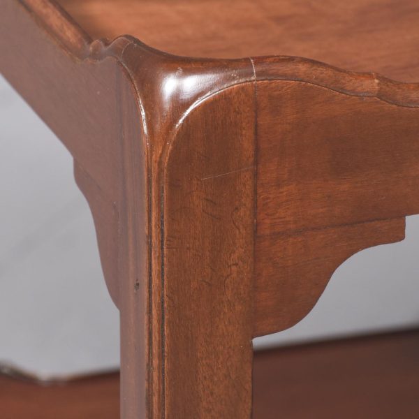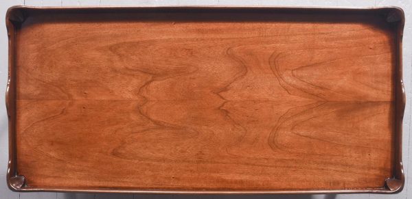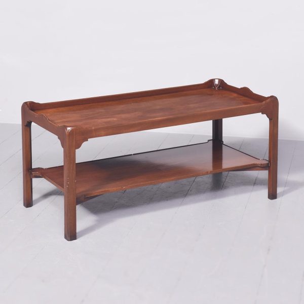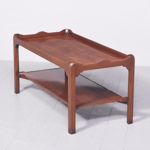 Circa 1990s. A quality George II style two tier coffee table probably by ‘Arthur Brett of Norwich’. The top in book matched mahogany with a wraparound wavy gallery with small reeding on the fore-edge. The table rests on four square legs with reeding on the facing, and chamfered on the inside, the legs are intersected by a shaped shelf.