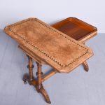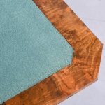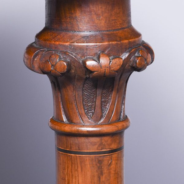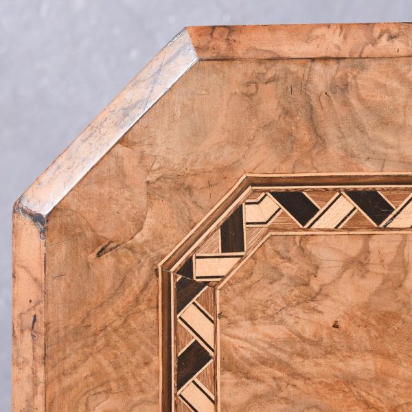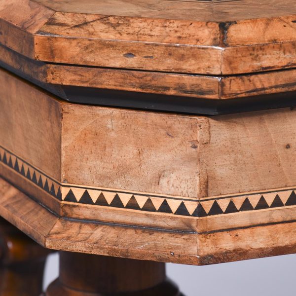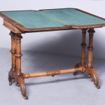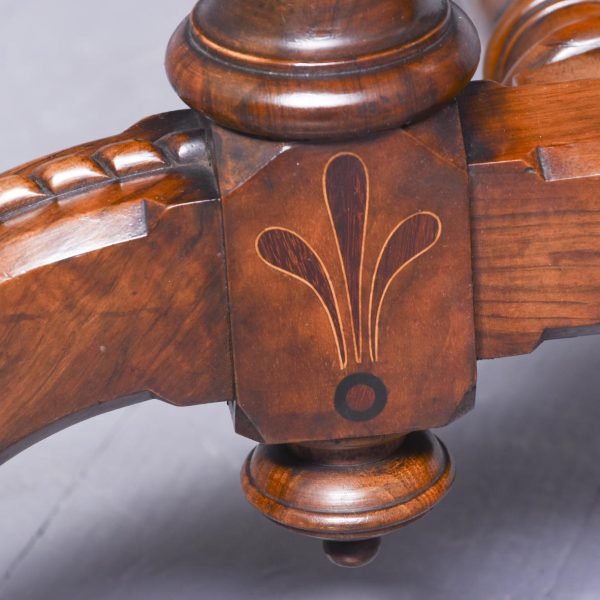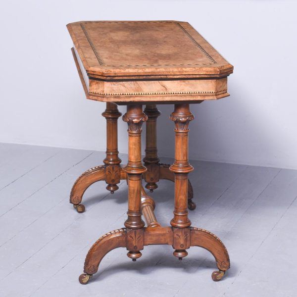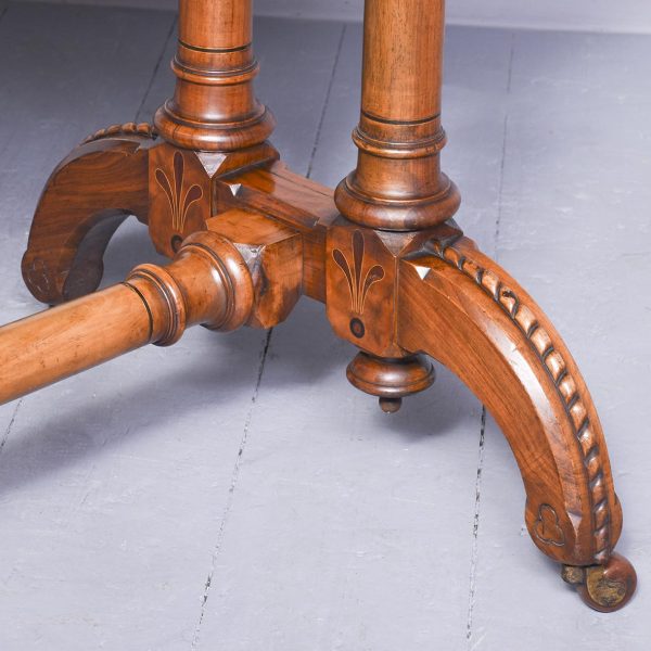 Circa 1880. A late Victorian walnut and inlaid turnover card table. The rectangular top with canted corners, quarter matched walnut top with zig zag boxwood and ebony inlay and various bandings. The top is hinged and opens to reveal felt lined interior with broad banding. The inlaid frieze with triangular boxwood, ebony inlay and simple beading beneath. Supported on four stylish carved turned and ring turned legs. United by a substantial stretcher with similar turnings, all resting on four downward facing legs with carving on the facing, and inlay on the ends, finishing with four brown porcelain castors.