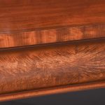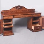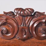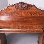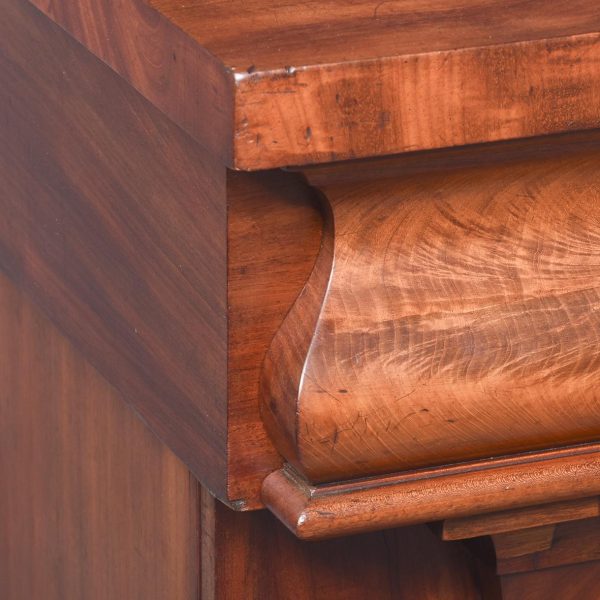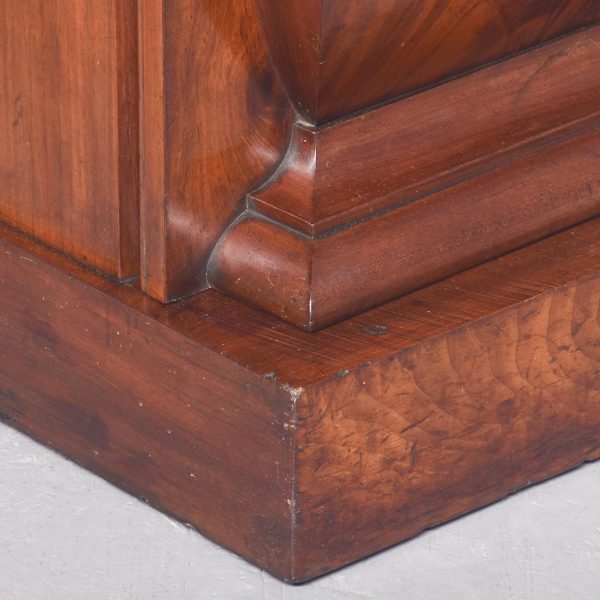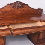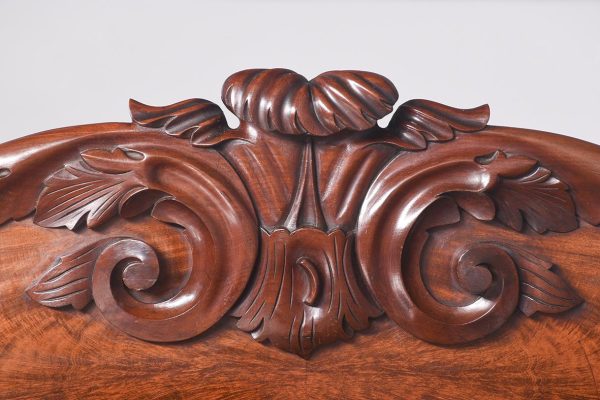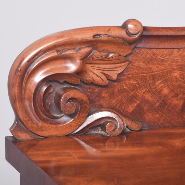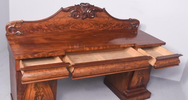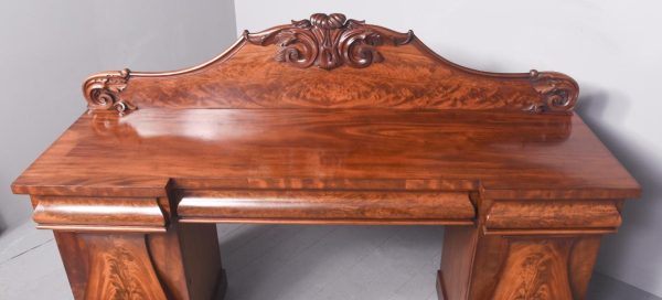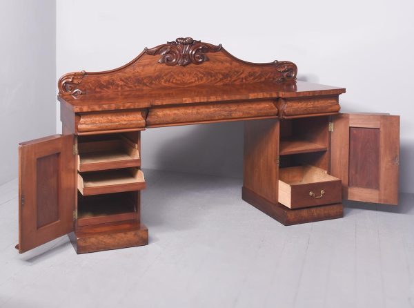 Circa 1850. An early Victorian mahogany pedestal side board, the back with a profusely carved upright with book matched flame mahogany, the curvaceous back which finishes with scrolling with further foliate carving, the large flat surface with wonderful figured mahogany, the flat fore-edge, the front with three cushion shaped drawers with matching flame mahogany a long center drawer flanked by a pair of shorter one. The pair of pedestals with full-length doors with raised mahogany panels in the finest figured mahogany, on one side it has pull-out slides on the opposite side is a shelf and a drawer, all resting on a closed plinth, the large mahogany sideboard has great colour patination.