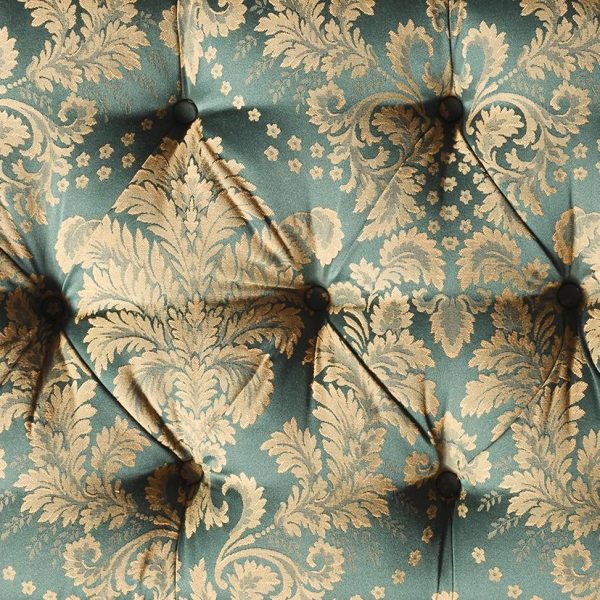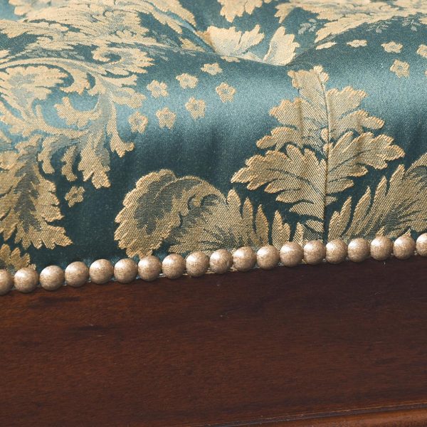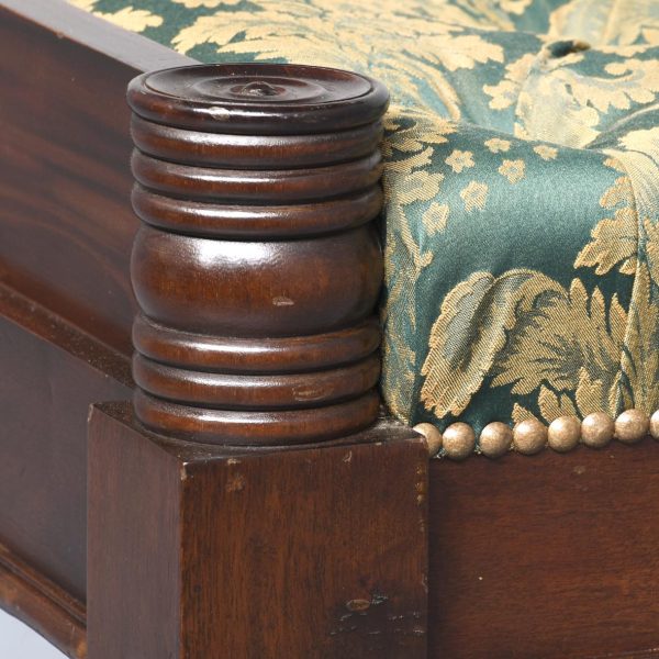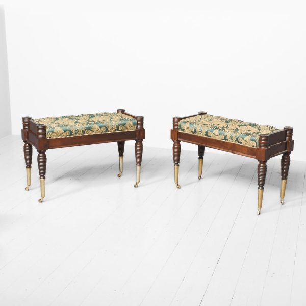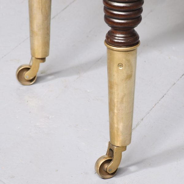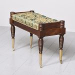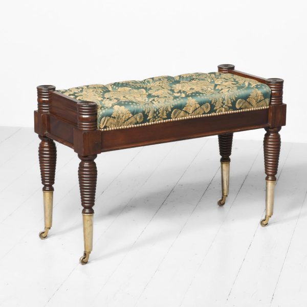Circa 2000. An unusual upholstered mahogany and brass window seat. The top in green and gold damask, pleated and dep buttoned. The upholstered seat is slightly recessed and has a raised rail at each end with a ribbed conical section. Large seat rail on all sides finishing with beading, the stool stands on four mahogany beehive tapering legs and finishing on elongated brass cups and finishing with brass castors.