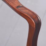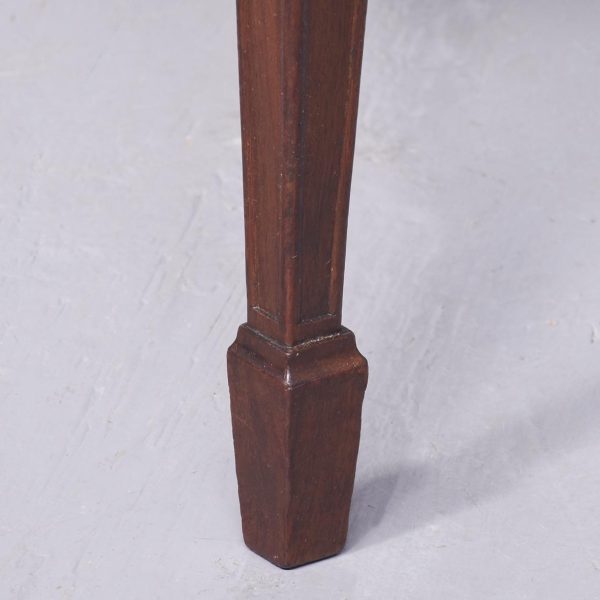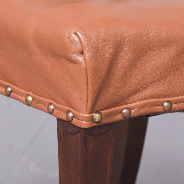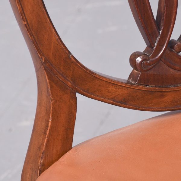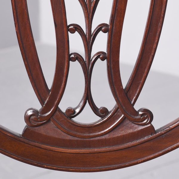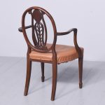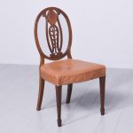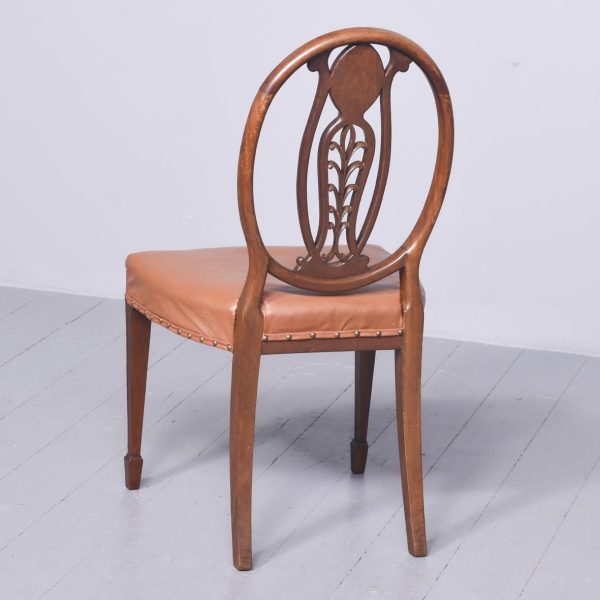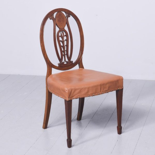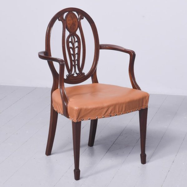 Circa 1880. A late 19th Century set of 8 Georgian-style inlaid mahogany dining chairs. The oval backs with curved splats and an inlaid medallion above a honeysuckle flower carving, the two carvers with shaped arms on curved supports. All with brass studded leather seats over square tapering legs and splayed toes.
