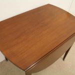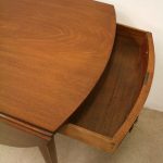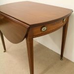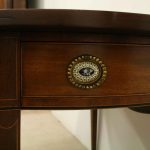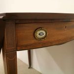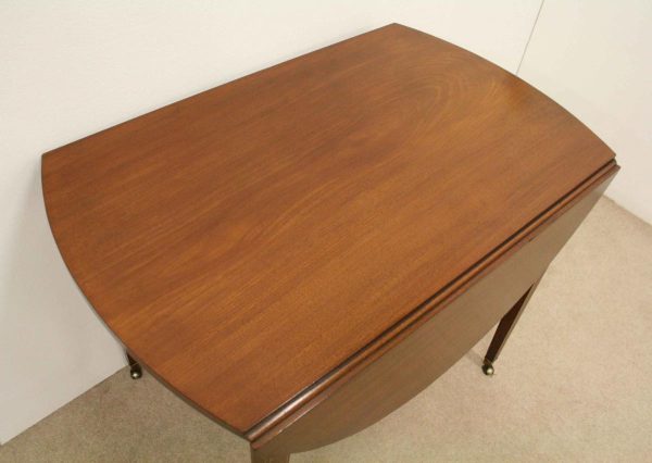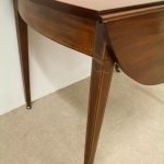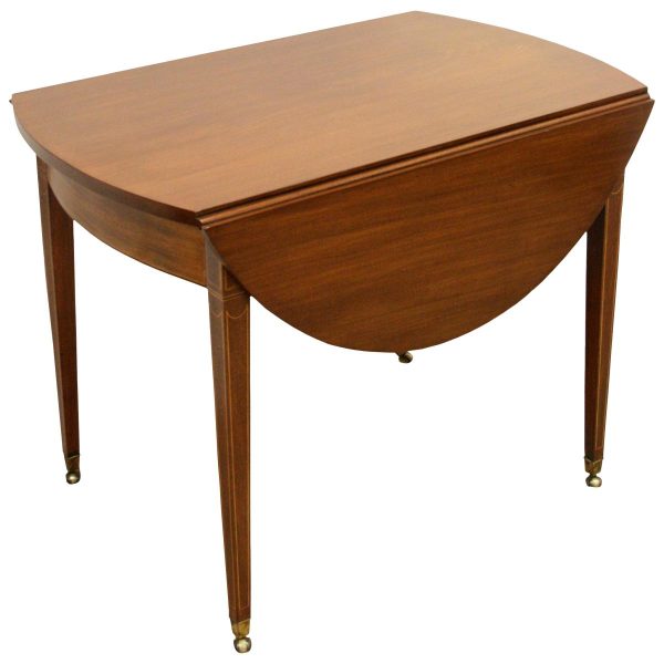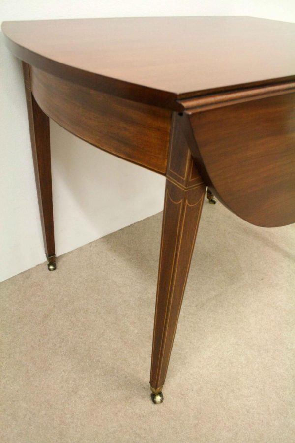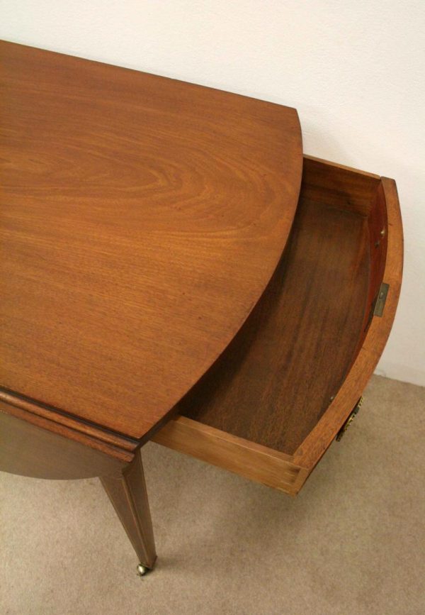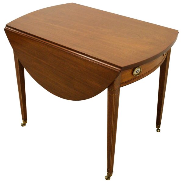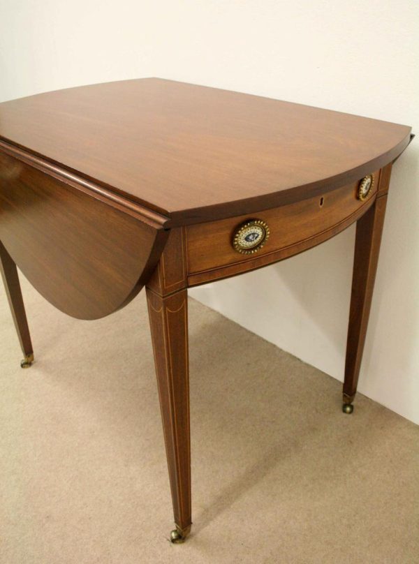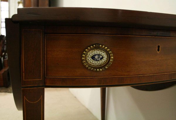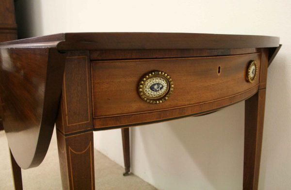 Circa 1800, late George III mahogany oval Pembroke table. The solid mahogany top has 2 oval drop leafs, held in position by mahogany arms which are tucked into the underside of the table. The back end has string ebony and boxwood inlay, and at the other end there is a single mahogany lined drawer. The drawer has a stylish heraldic style escutcheon, cock beaded fore edges and very unusual gilt brass and enamel handles. The gilt brass handles are held in place by a screw at the back and the oval panel with the enamel is fixed onto the drawer front separately. It has a brass bezel and is very stylish with flowers and swags. The whole piece stands on 4 elegant square tapering legs. The top of the legs have a classic inverted arch inlay which occurs on some Edinburgh furniture. As the legs taper and finish there is a brass cup and the whole piece stands on squat brass castors. The table has been re-polished and is clean. It has a wonderful presence and very interesting style.