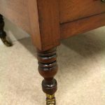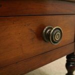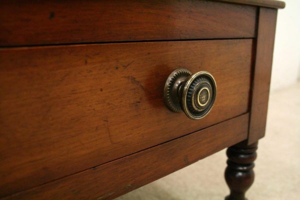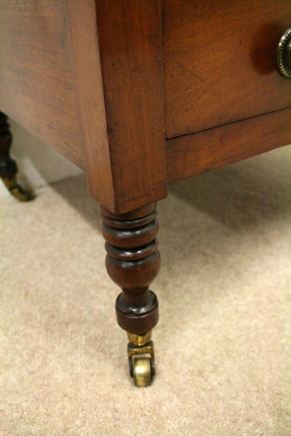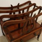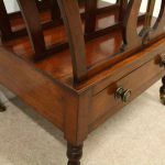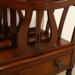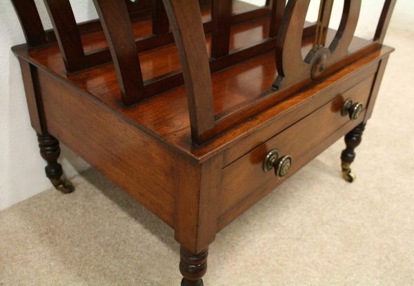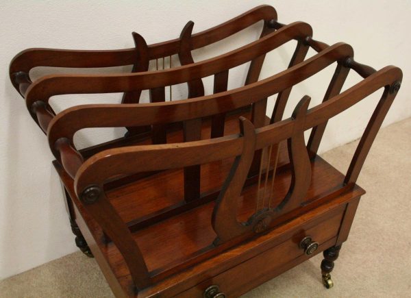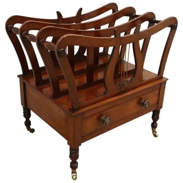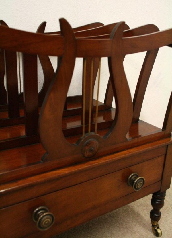 Circa 1830, late George IV mahogany Canterbury. The top has four curved sections held in place by simple turned supports. The uprights in the centre are rectangular struts, and there are lyre shaped ends with 3 brass coloured strings. Below this is a drawer with two brass knob handles. All standing on four stylish squat turned and tapering legs finishing on brass cup castors. The Canterbury is polished on all sides and is freestanding. Great colour and good condition.