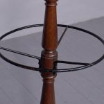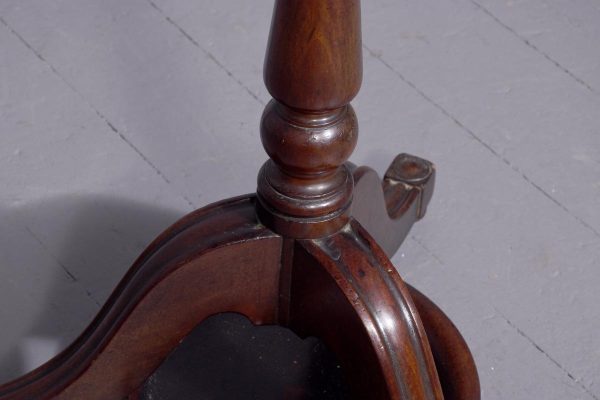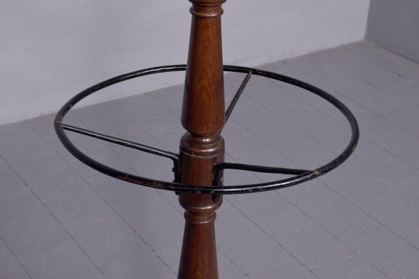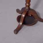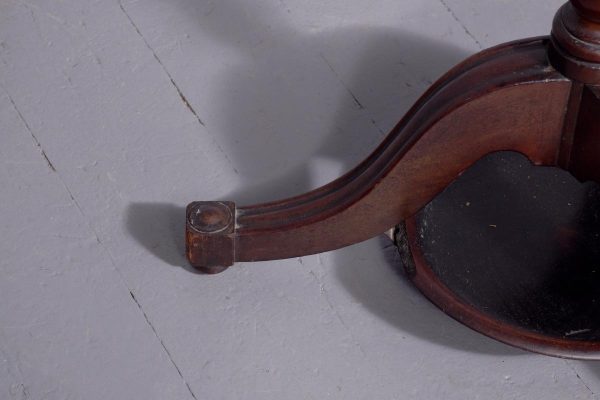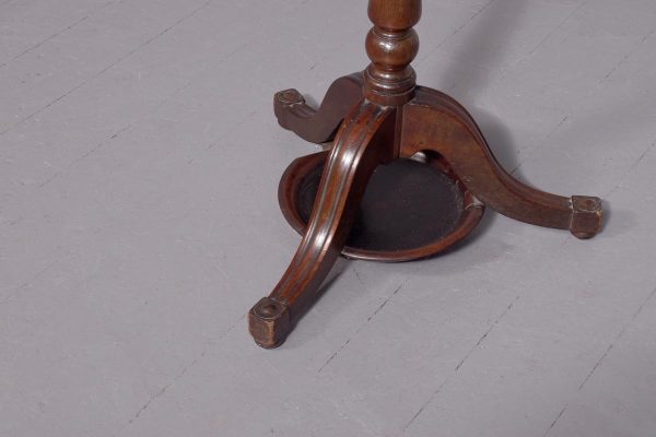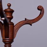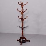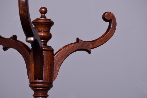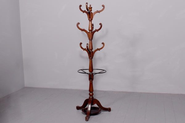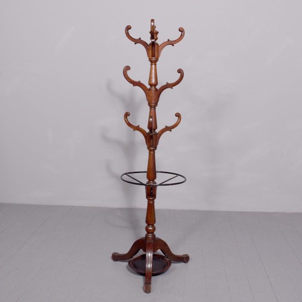 Circa 1830.Late Georgian circular mahogany hall tree, surmounted by a turned finial over three rows of curved and shaped coat and hat hooks on a turned central pillar above a circular metal umbrella holder. Supported on fluted cabriole legs with neat bun feet around the original mahogany drip pan.