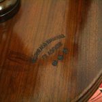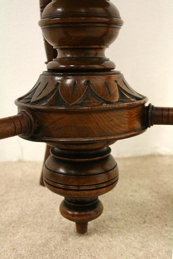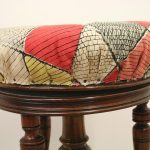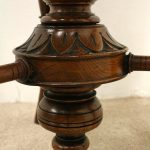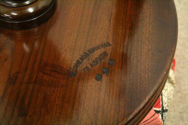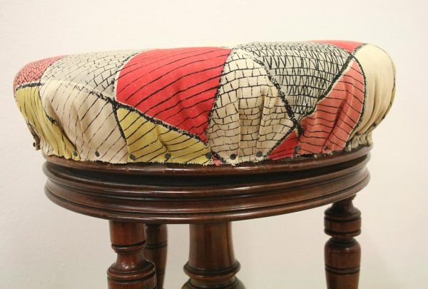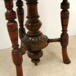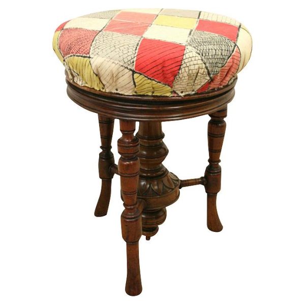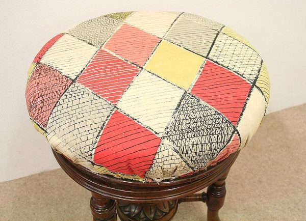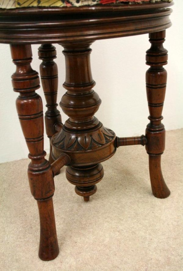 Circa 1880, very fine quality late Victorian adjustable circular piano stool by Muirhead & Turnbull Glasgow (makers stamp on the underside), on turned splayed supports, with a very fine central floral carved stem with finial below. Unusual style and quality.