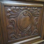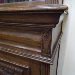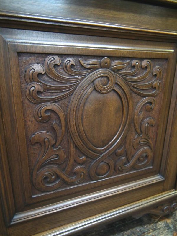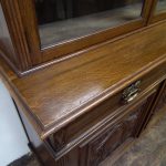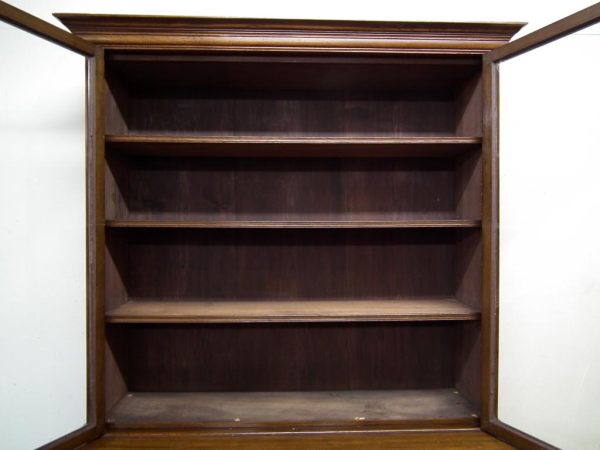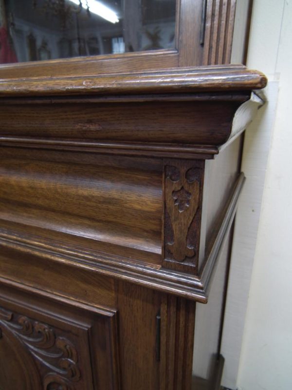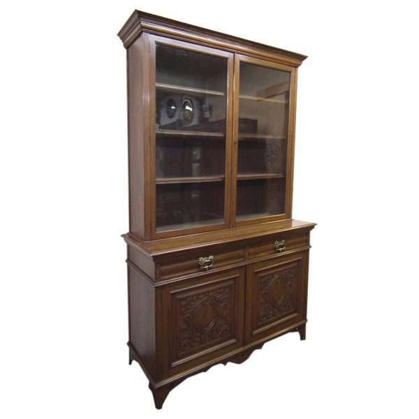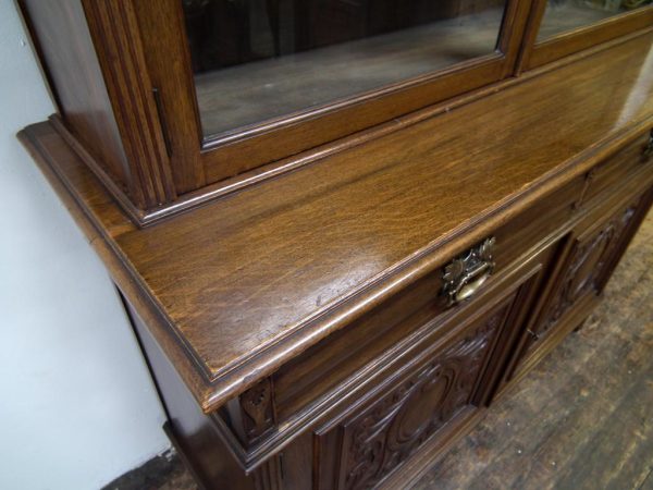 Circa 1890, late Victorian Art Nouveau oak cabinet bookcase. The simple cornice over 2 glazed doors with a cock beading, which open to reveal 3 adjustable shelves with oak facings. On either side of the doors are ribbed facings, and this continues on the bottom also. The flat surface has a stylish double moulded fore edge and beneath this are two drawers with ogee shapes and very stylish cast brass Art Nouveau handles. Between the drawers is a carved piece in the form of an urn and this occurs again on the left and right. Beneath the drawers are two panelled doors, with a solid carved oak section on both panels in the Art Nouveau style with foliate carving and an oval swirl in the centre. Inside is a single fixed shelf. Beneath this is an ogee moulding and open fretwork beside the feet. The feet are simple, almost a continuation of the ribbing on the front. The bookcase is clean, sturdy and comes in two pieces.