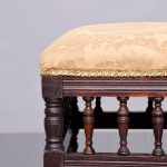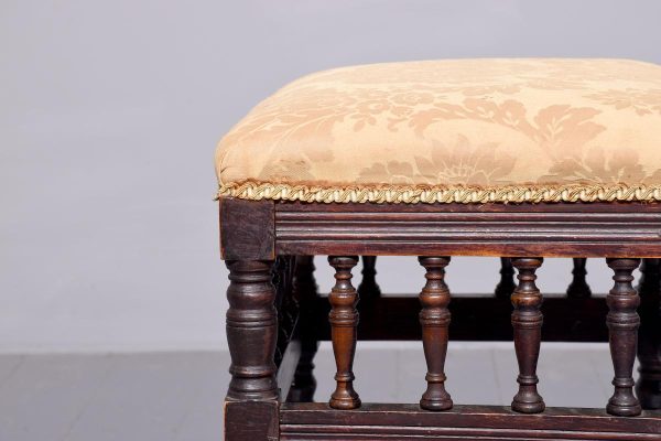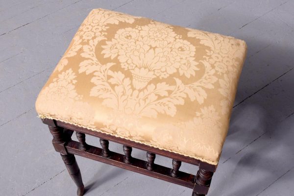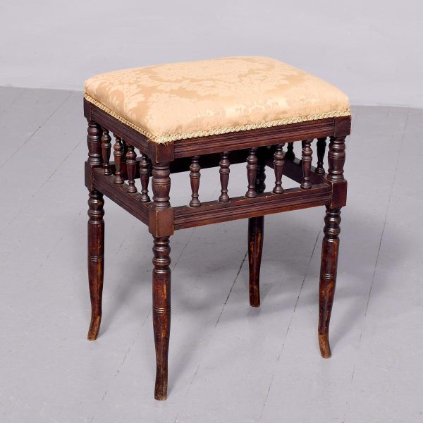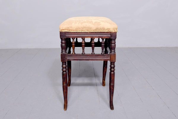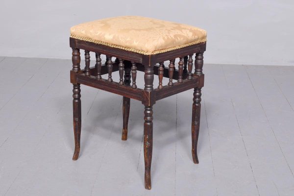 Circa 1890.Late Victorian birch spindled stool. The over-stuffed top with good horsehair upholstery (could do with re-covering?) on a fluted seat rail above rows of spindles above a further seat rail all on neat ring turned legs without swept toes.