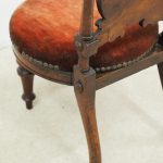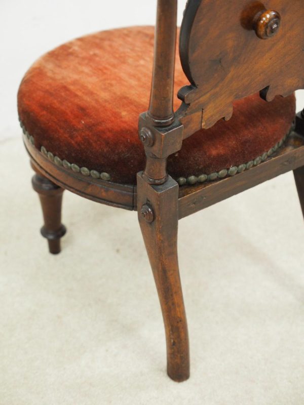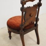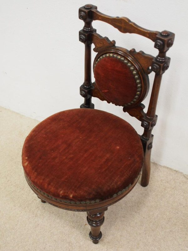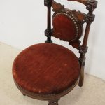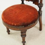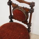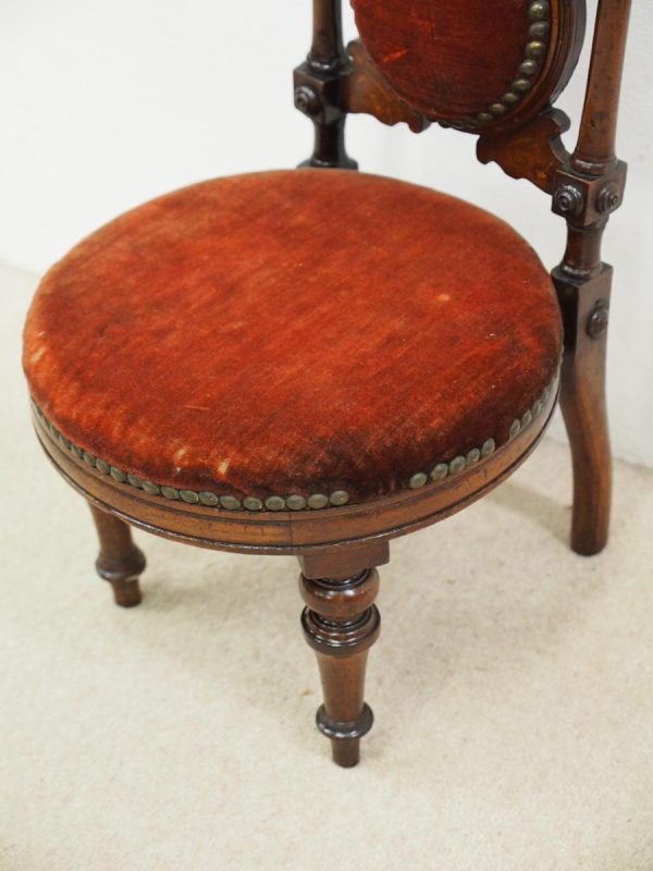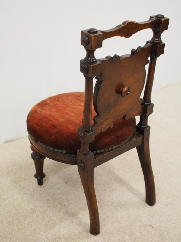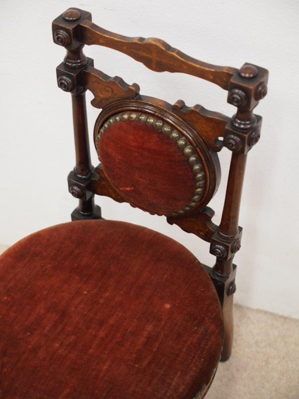 Circa 1890, Late Victorian inlaid mahogany child’s chair. The shaped inlaid top rail sits over a circular upholstered panel with inlaid brackets, supported by turned uprights with block and roundel decorations. The circular seat with a moulded mahogany rails is over neat, turned feet to the front and splayed rear feet.
