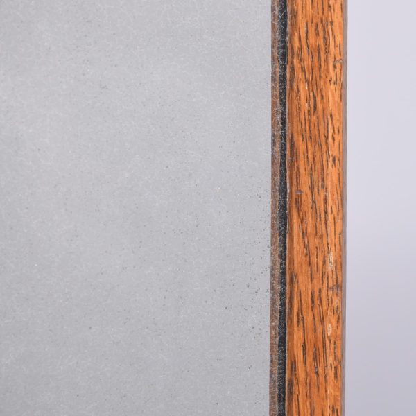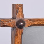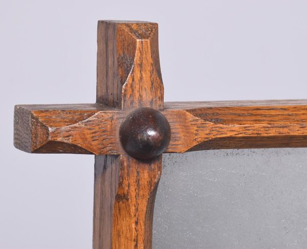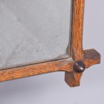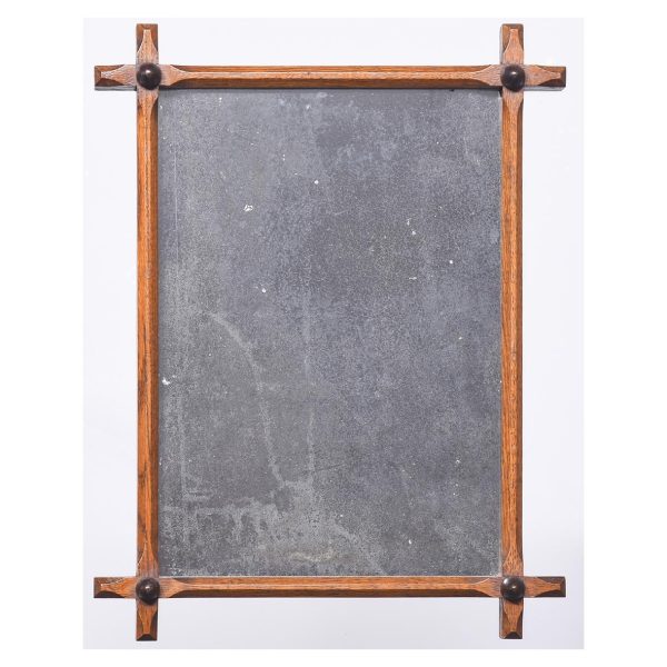 Circa 1880. Late Victorian Gothic oak- framed wall mirror. The chamfered oak frame with cruciate corner extensions with turned roundels. Mirror with a lovely colour and patina and its original mercury mirror plate in good condition and with a solid pine back. Rustic and decorative!