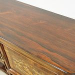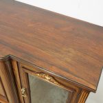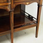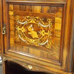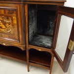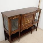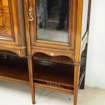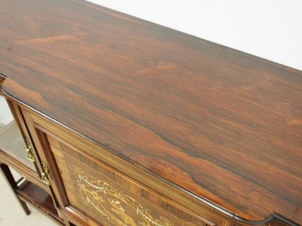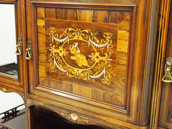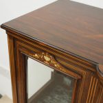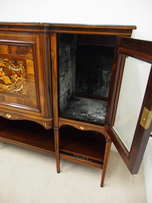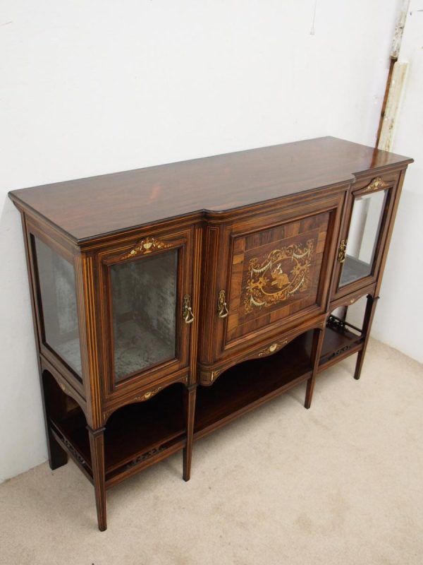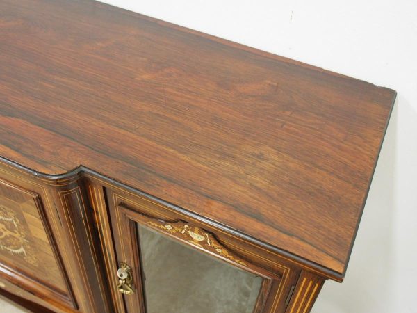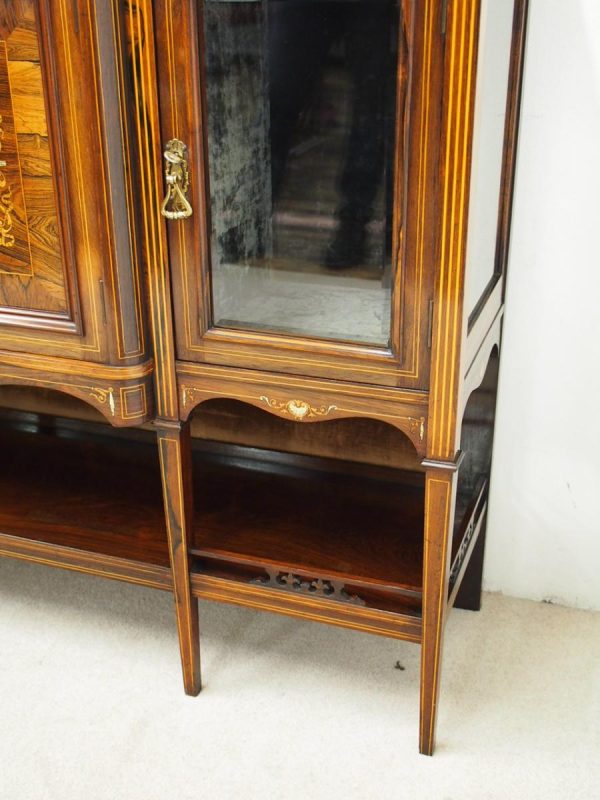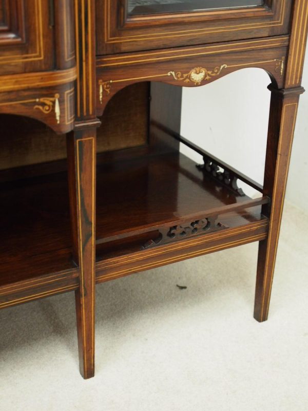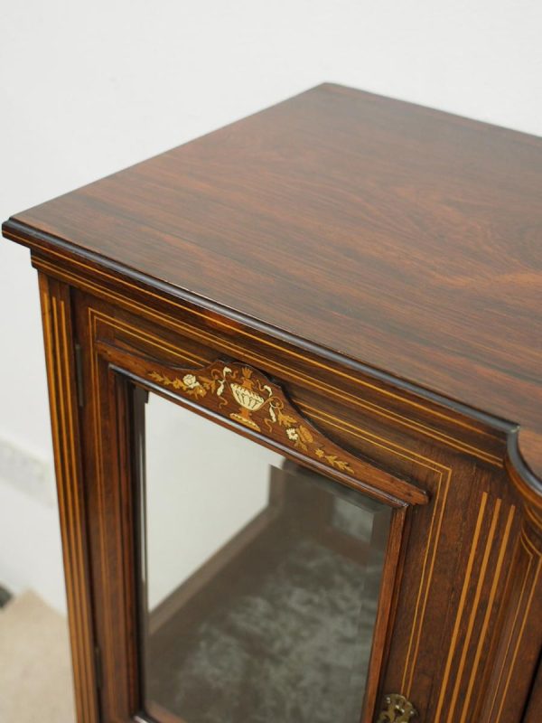 Circa 1890, late Victorian marquetry inlaid rosewood cabinet. The bow front top with inlaid fore edges sits over three glazed cabinets (plate glass shelves can be added) with inlaid tapering supports at the sides and partially galleried under stretcher.