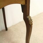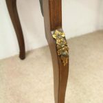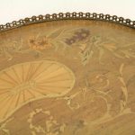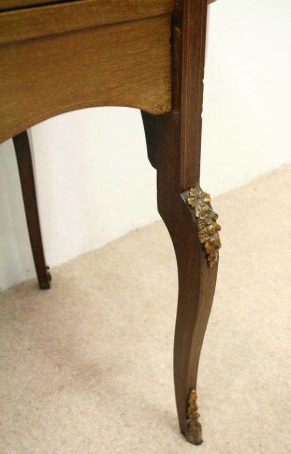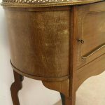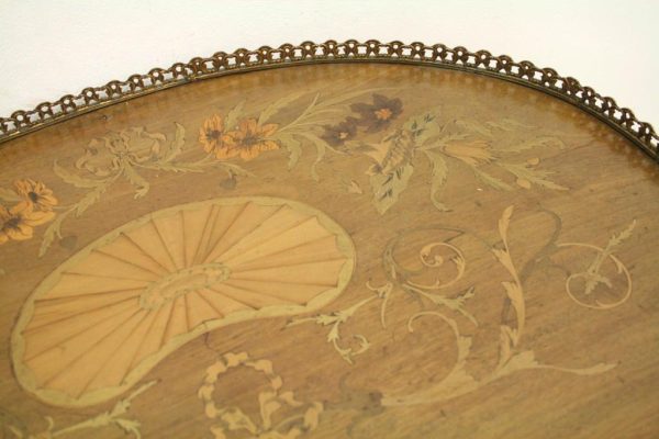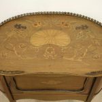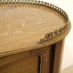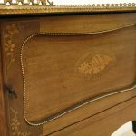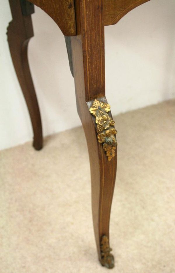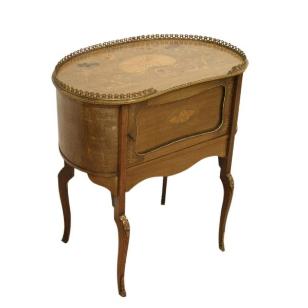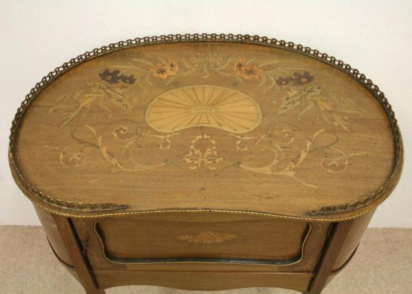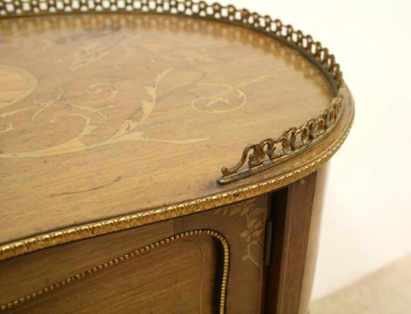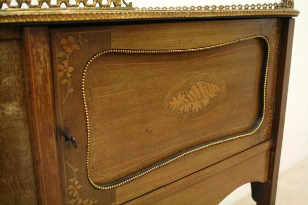 Late Victorian marquetry inlaid side table/cabinet with fretted brass gallery and a cupboard with a shell inlaid door standing on cabriole supports with floral brass mounts.