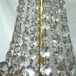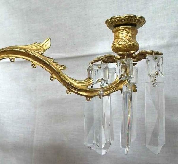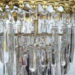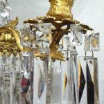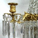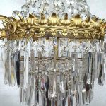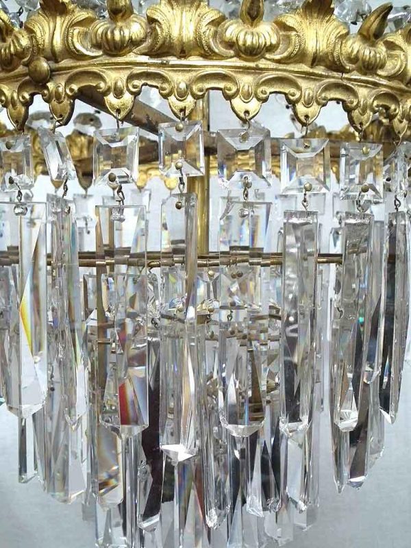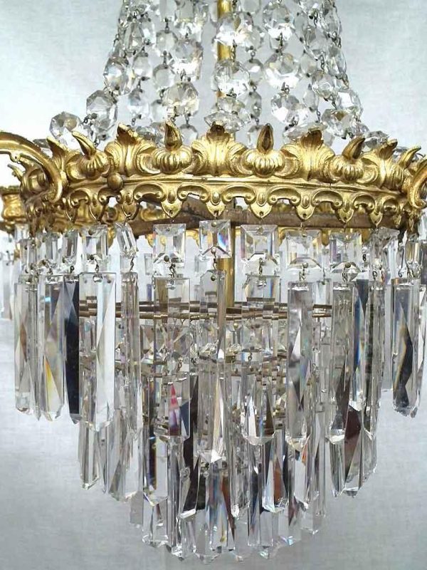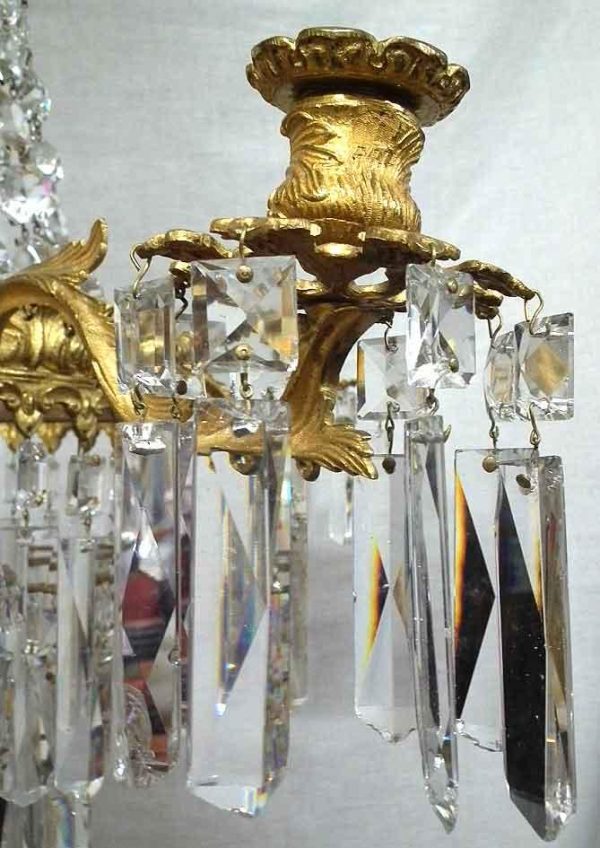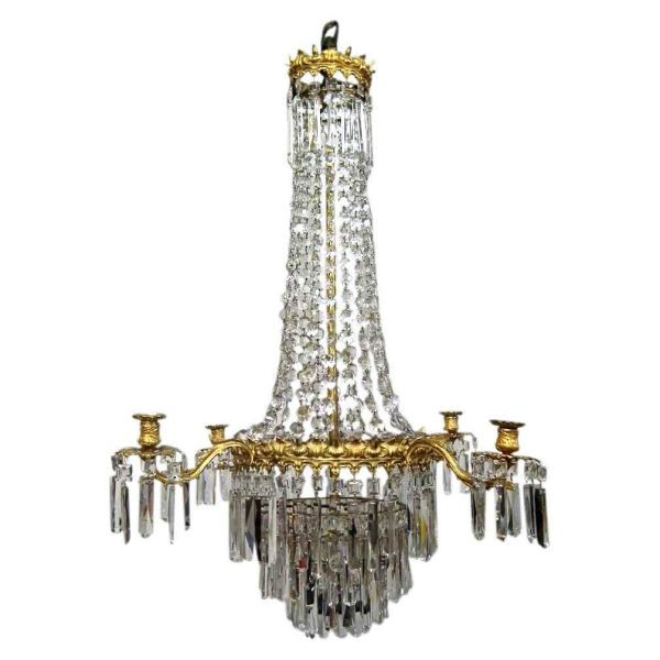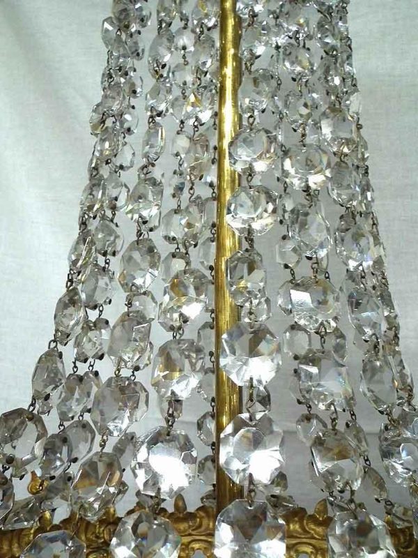 Circa 1880, late Victorian ormolu and glass chandelier, almost in the form of bag and tent. The top has a circular bezel in the form of a cornette with long glass drops beneath. From this run several chains of diamond shaped glass strung together which trail down to the lower section. There is a larger ormolu bezel in the same form of the top, and from this come four Rococo style arms with candleholders, recently rewired for electricity. The candleholders have stylish sconces and foliate casting, and again finish with long glass drops. The main body has four layers of glass drops, and at the bottom is a simple flower head finial to finish it off.