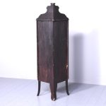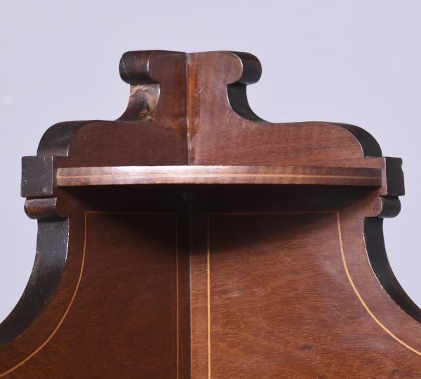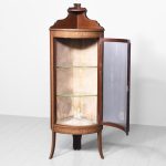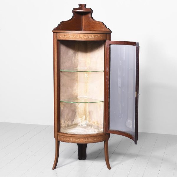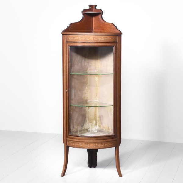 Circa 1890. Late Victorian Sheraton style inlaid bowfront corner cabinet in fiddleback mahogany. The polished top with boxwood string inlay and a shaped inlaid pediment with a demi-lune shelf. The bowfront glazed door with an inlaid frame opens to interior with two glazed shelves over base with matching foliate and shell inlay. The sides with simple inlaid pilasters extending down as splayed legs.