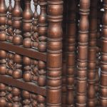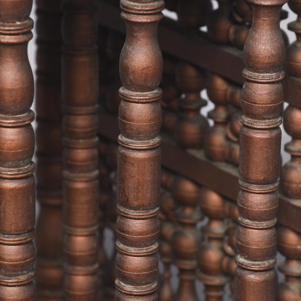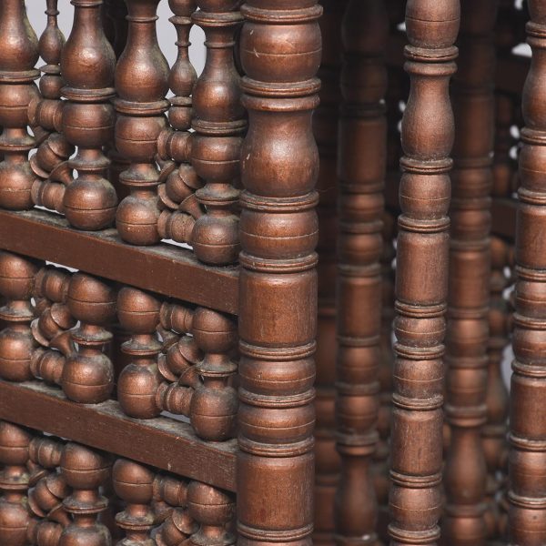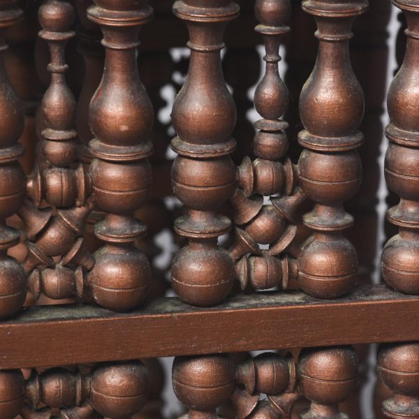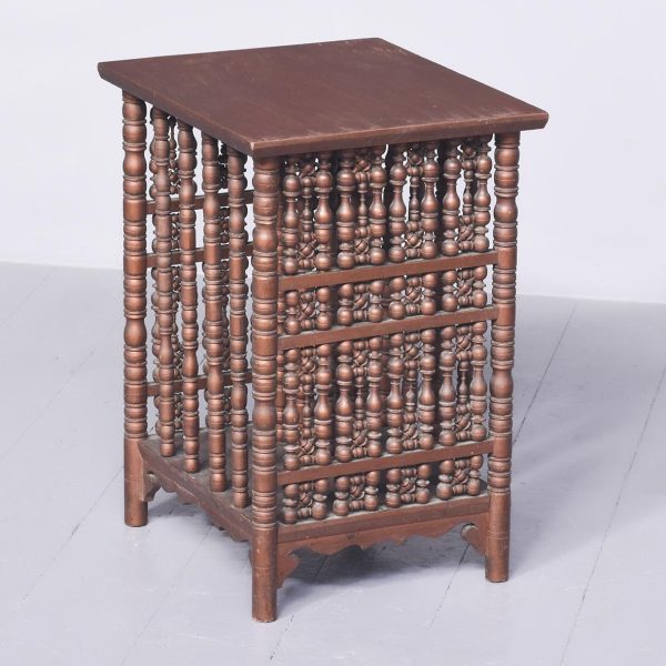 Circa 1900. A small painted occasional table or Canterbury probably retailed by ‘Liberty & Co’. The Moroccan mashrabiya table, with rectangular top with a simple fore edge, the two ends in fine Moroccan mashrabiya work supported on four bobbin turned uprights. The rest of the table which could be called a Canterbury is supported on 15 turned balustrades, sitting on a shelf beneath a shaped apron and the table rests on turned feet.