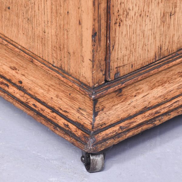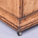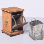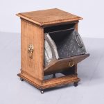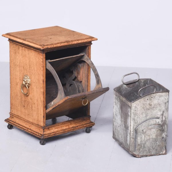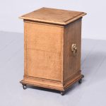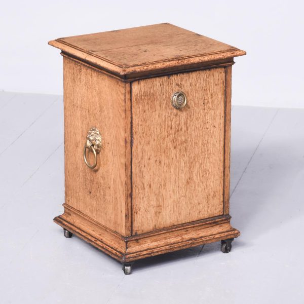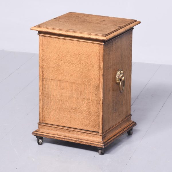 Circa 1860. A mid Victorian honey oak coal box or purdonium. The square top with a stylish moulded edge, the sides a pair of cast brass lifting handles with lion heads with brass rings through the mouth, the front there is a cast brass ring handle with elegant back plate, opens to reveal a metal lined interior, which is removable. There are further mouldings in the base and the whole piece rests on four castors.