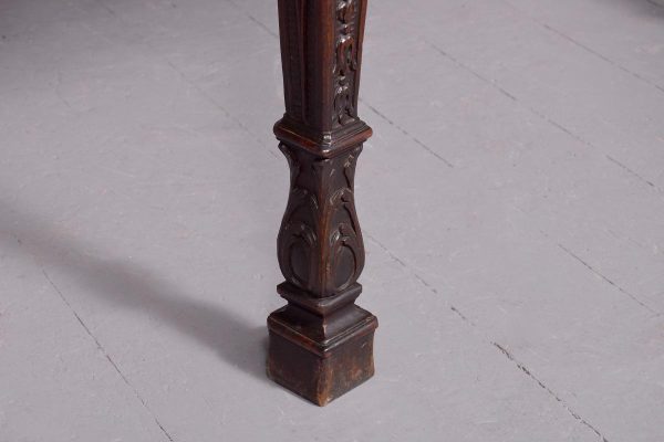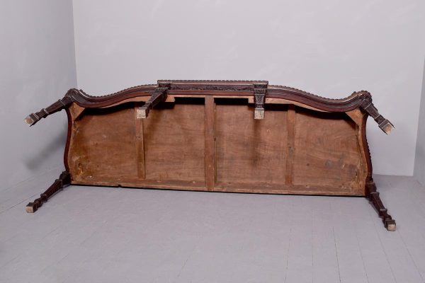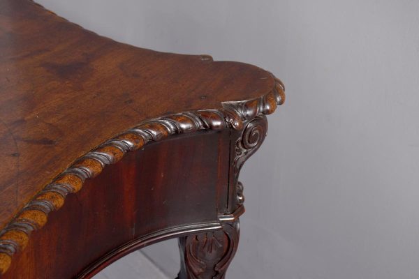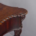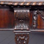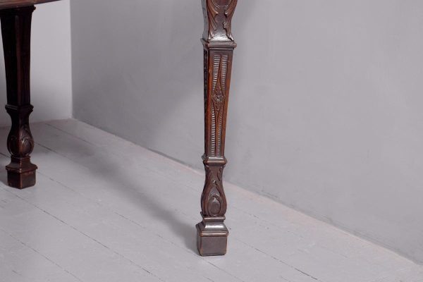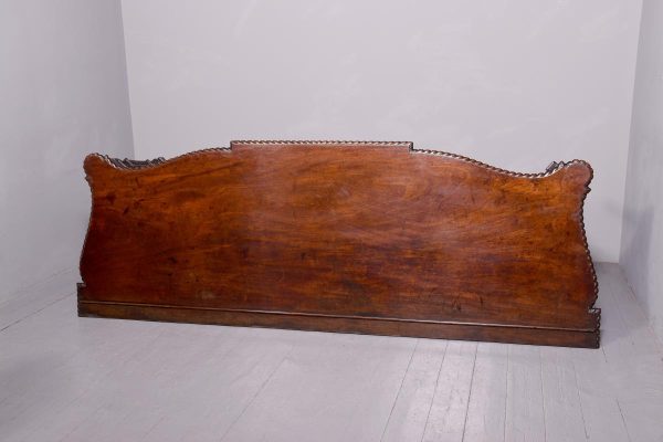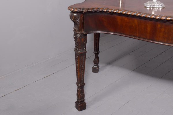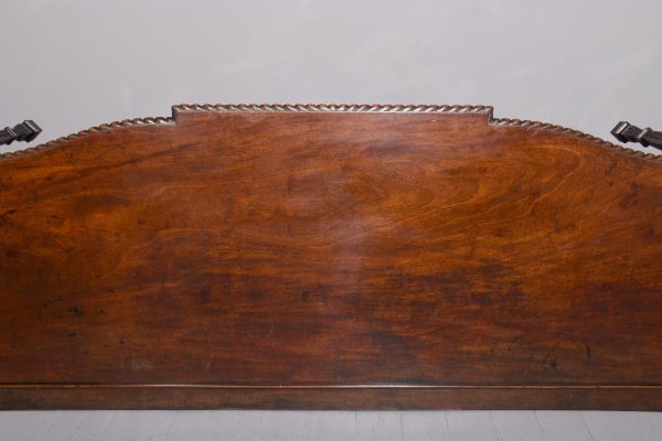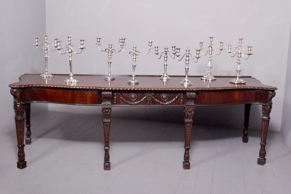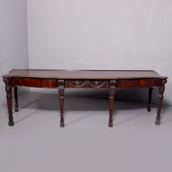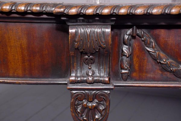 Circa 1770. An important carved mahogany sideboard from the estate of ‘Lord Leverhulme’. The massive shaped sideboard with the one piece top in the finest Cuban mahogany, the shaped front with finely carved dragooning with extra foliate carvings in the corners, the shaped frieze with a center of pairs of swags and tails with carved flower-heads and carved rondels, he rest of the frieze follows the form of the top and is beaded at the bottom, resting on six profusely carved legs each headed with a carved corbel with foliate carving on the front and scrolling on the sides, the stylish legs are also carved in sections which tapering from top to bottom, all supported on large square blocks.
