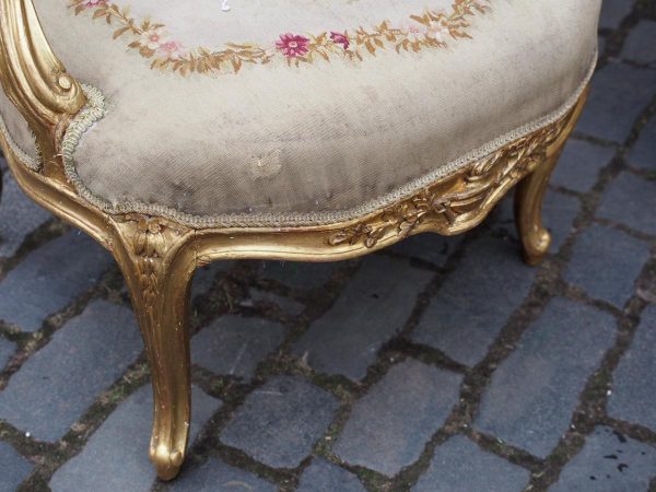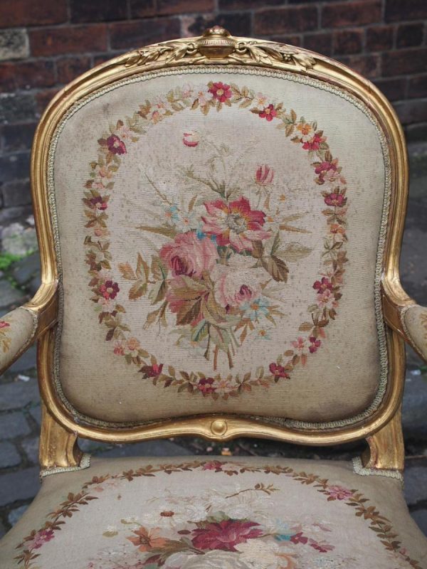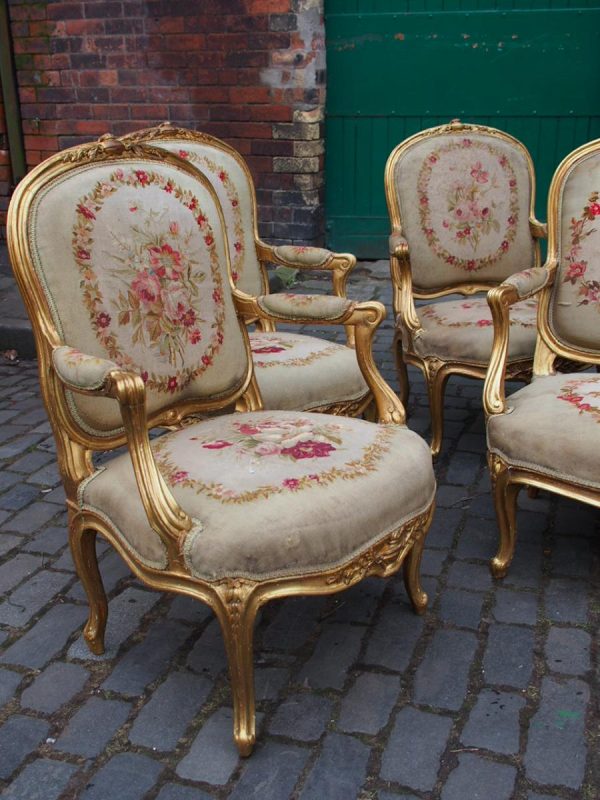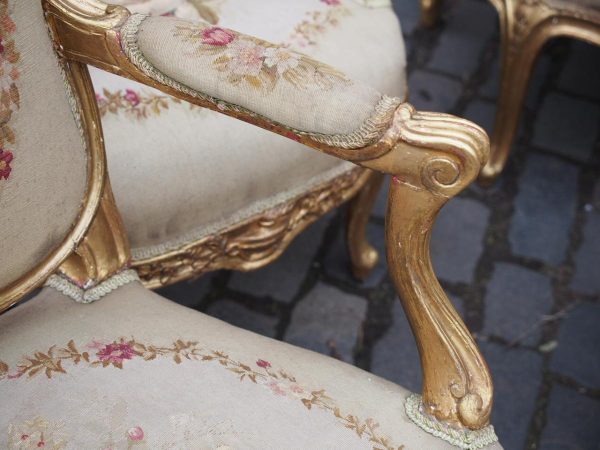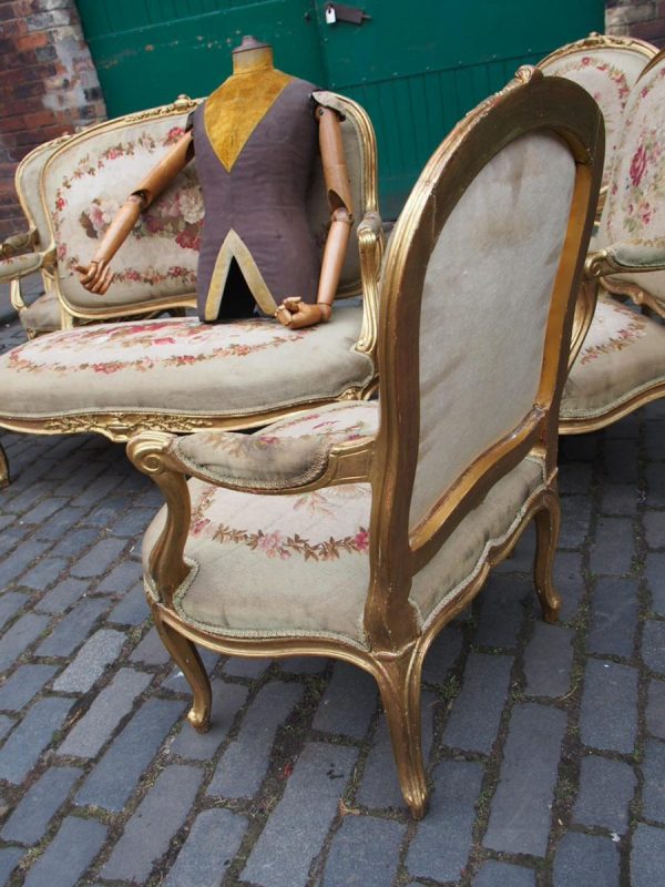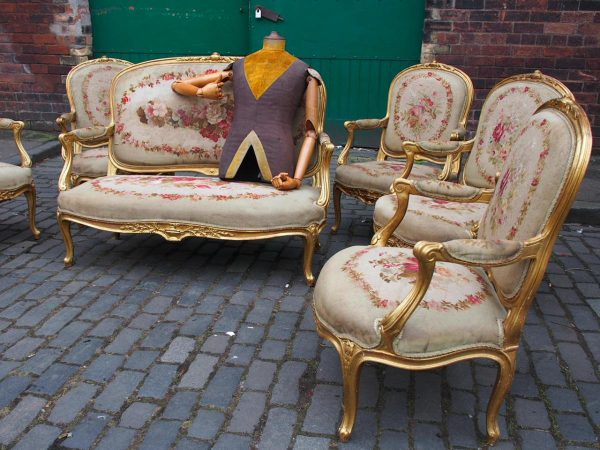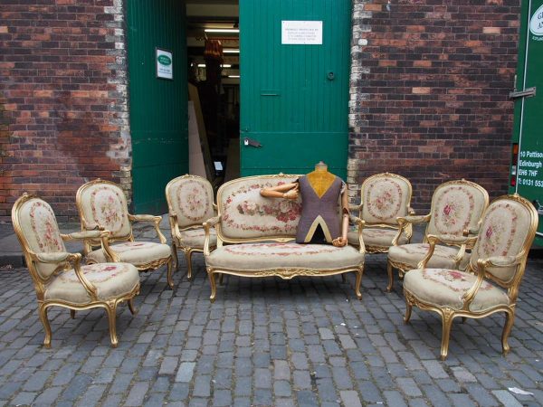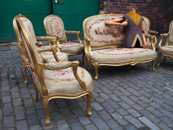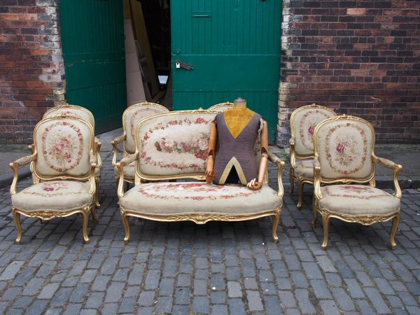 Circa 1860, mid Victorian Louis XV style seven piece parlour suite consisting of giltwood canapes (sofa) and set of 6 giltwood fauteuils (armchairs). The armchairs, made from carved and gilded hardwood, have a cartouche shaped back, carved top crest and out swept arms. They have a stuffover serpentine upholstery seat and a very fine needlepoint on the back. The shaped apron leads on to foliate carved scroll feet. The sofa is of similar design with similar carving and upholstery.