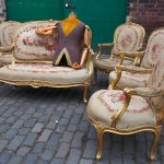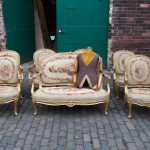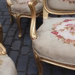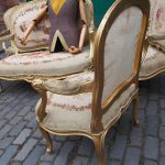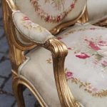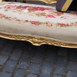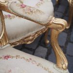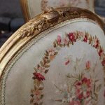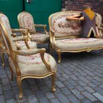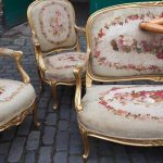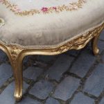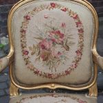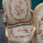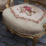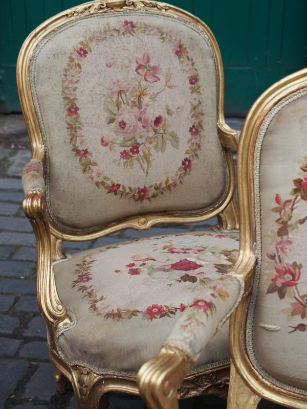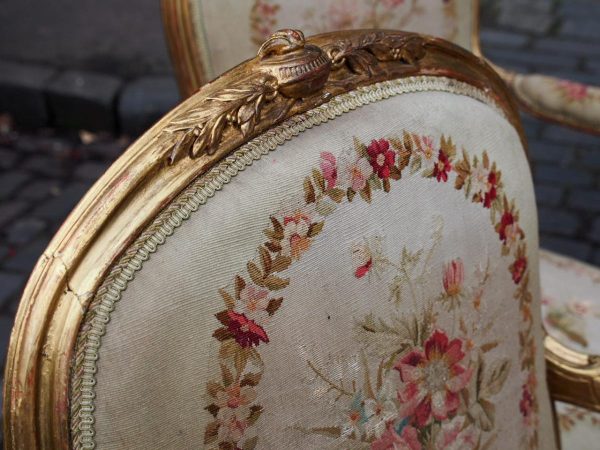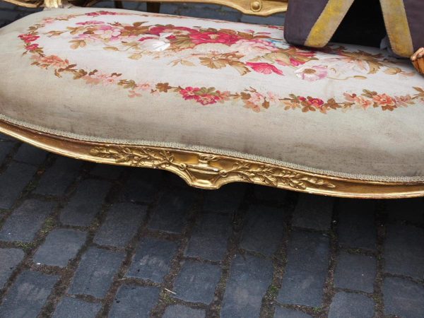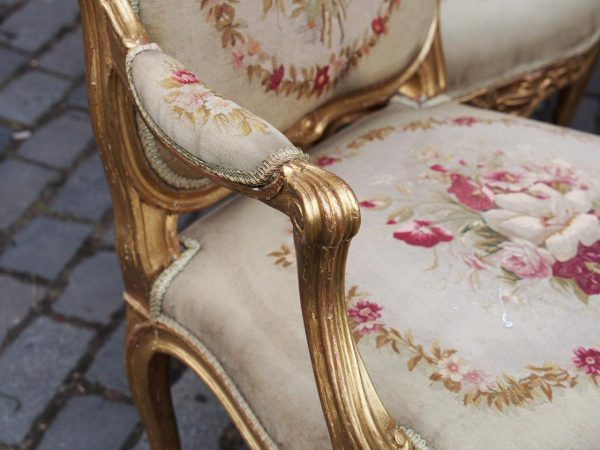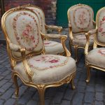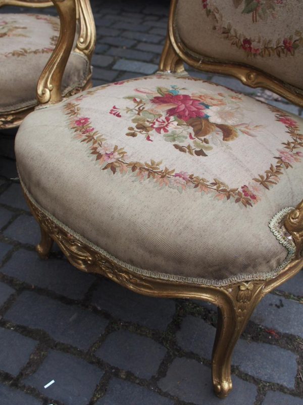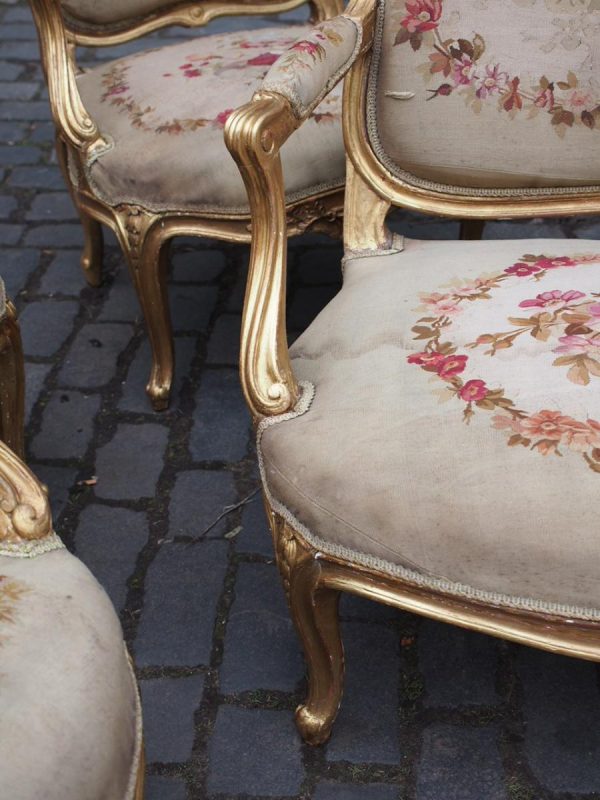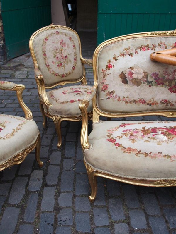 Circa 1860, mid Victorian Louis XV style seven piece parlour suite consisting of giltwood canapes (sofa) and set of 6 giltwood fauteuils (armchairs). The armchairs, made from carved and gilded hardwood, have a cartouche shaped back, carved top crest and out swept arms. They have a stuffover serpentine upholstery seat and a very fine needlepoint on the back. The shaped apron leads on to foliate carved scroll feet. The sofa is of similar design with similar carving and upholstery.