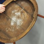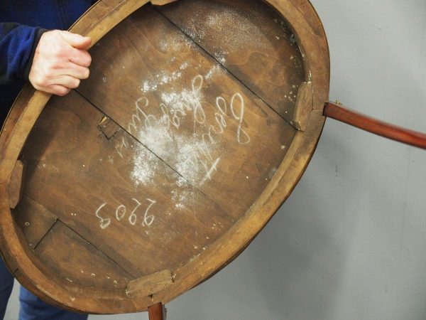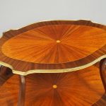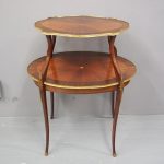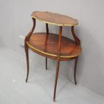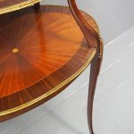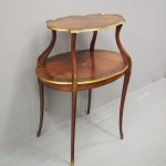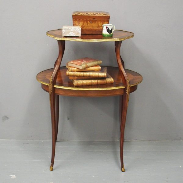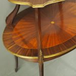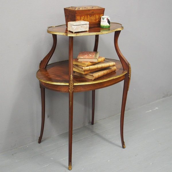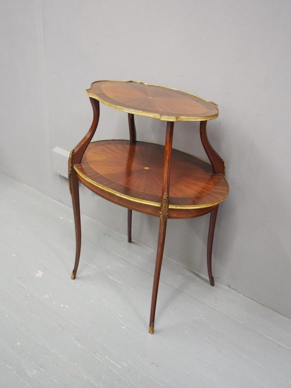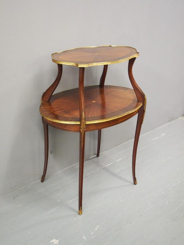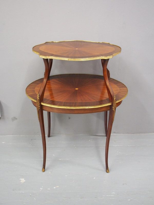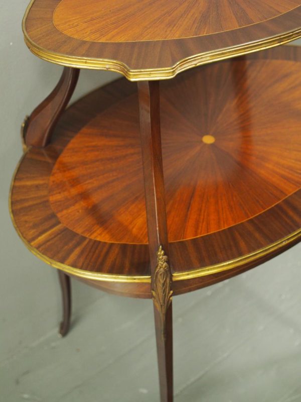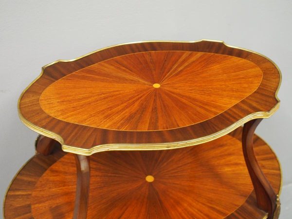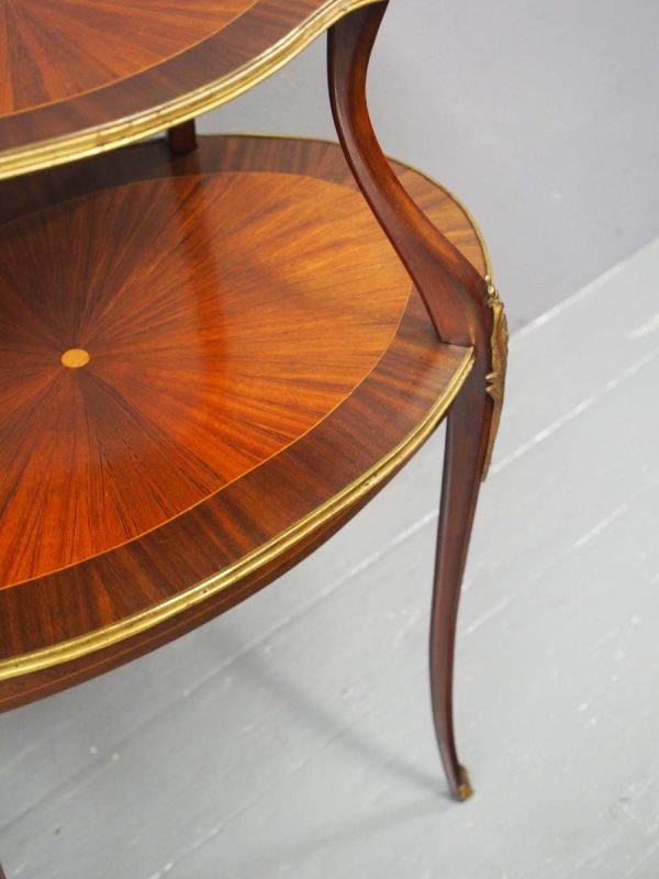 Circa early 1900s, Louis XV style, two-tier ormolu mounted kingwood and mahogany etagere. The shaped oval top has a central satinwood roundel surrounded by a kingwood fan, boxwood stringing, mahogany cross banding within ormolu mounted edges above a larger conforming under shelf. All on shaped, chamfered supports extending down as cabriole legs with ormolu mounted knees and sabots.