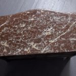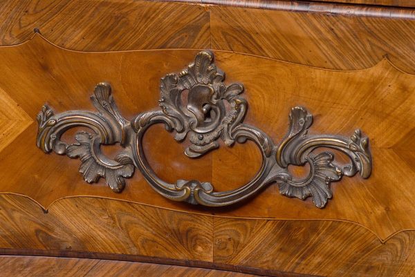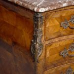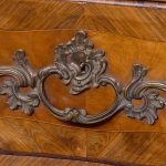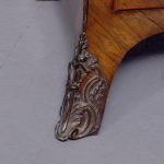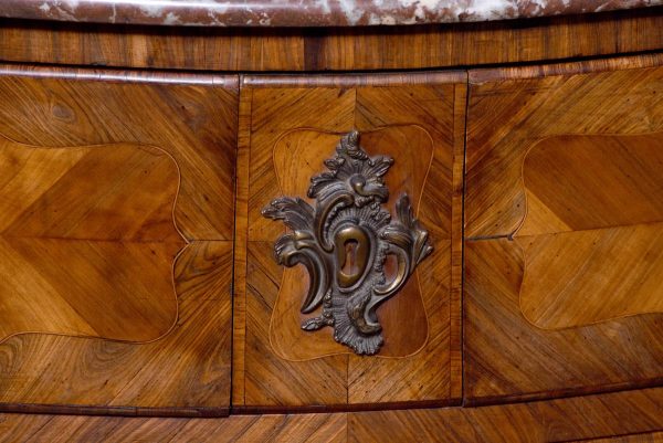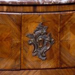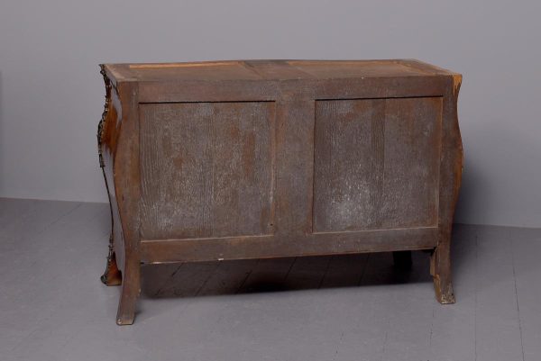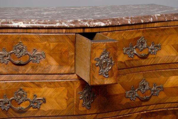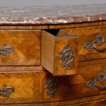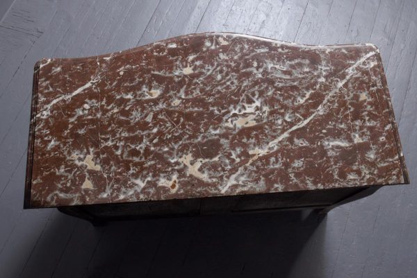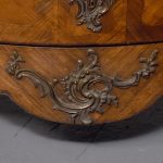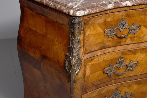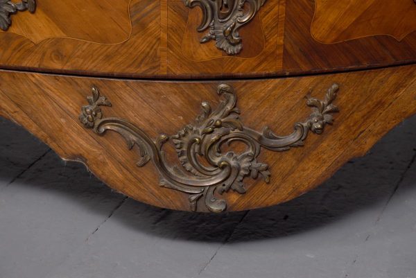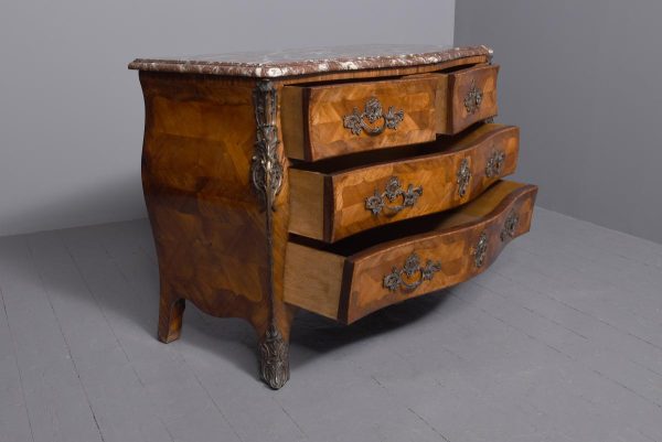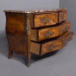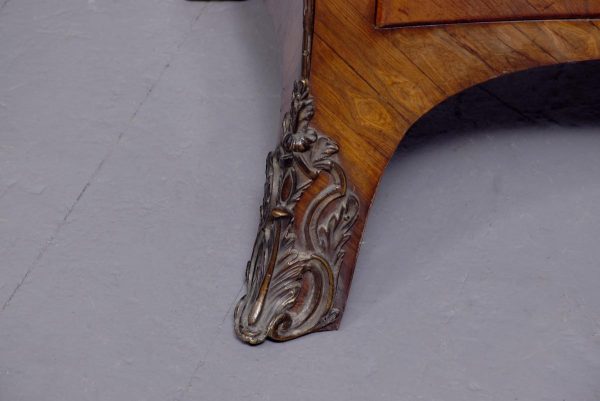 Circa 1880. A Louis XV style French kingwood marble top commode, the thick serpentine marble top with a lovely double moulded fore-edge, the serpentine bombe shaped base with lovely bronze mounts to the fore-edges and sabots beneath, with a configuration of two over three serpentine drawers, each with the finest pierced Rococo cast brass handles with elegant escutcheon, beneath the bottom drawer there is a shaped frieze which has a mount on it, the gables with parquetry and quarter matching panels, all framed in boxwood, between the top two drawers there is an escutcheon in the center, is in fact a secret drawer.