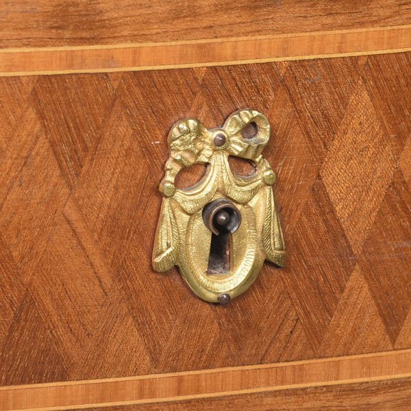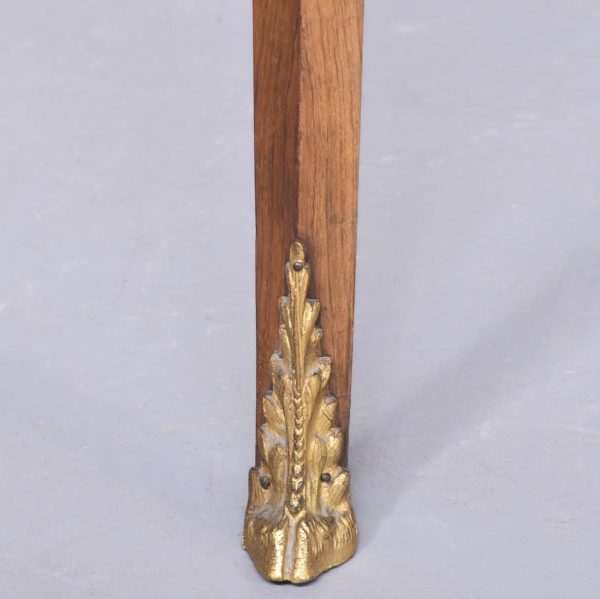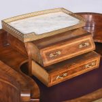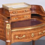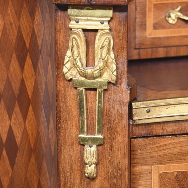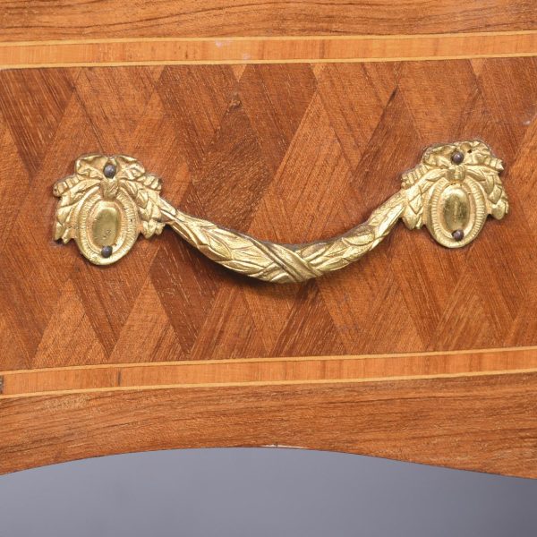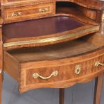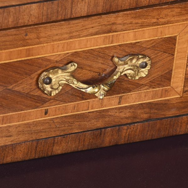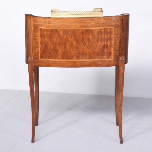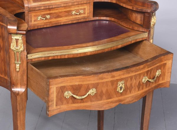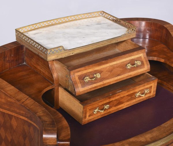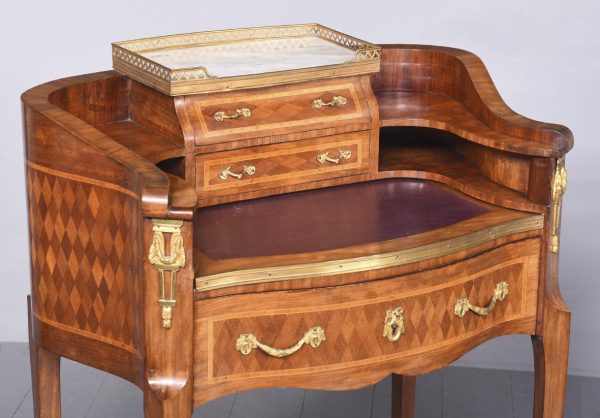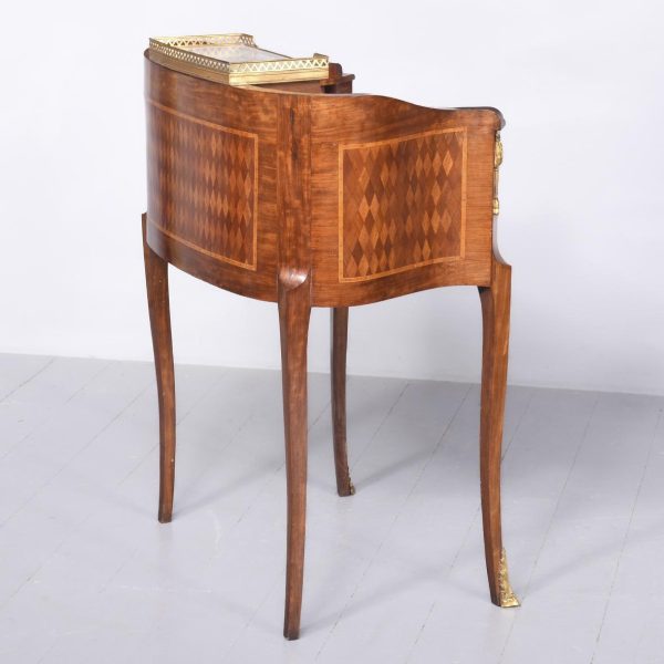 Circa 1930. Louis XV style ormolu mounted walnut ladies writing desk. The shaped desk with a variegated white marble top with a ¾ brass gallery and 2 short drawers with parquetry inlay and ormolu (gold cover bronze handles). With shaped sides, a purple leather writing slide above an inlaid and parquetry inlaid frieze drawer with elaborate escutcheon and shaped skirt. The desk is free standing with parquetry panels at the sides and back, all supported on cabriole legs with neoclassical ormolu mounts and sabots.
