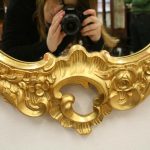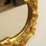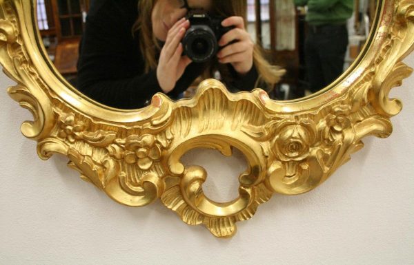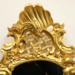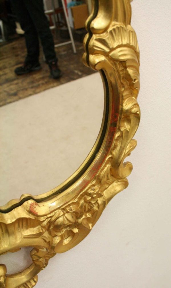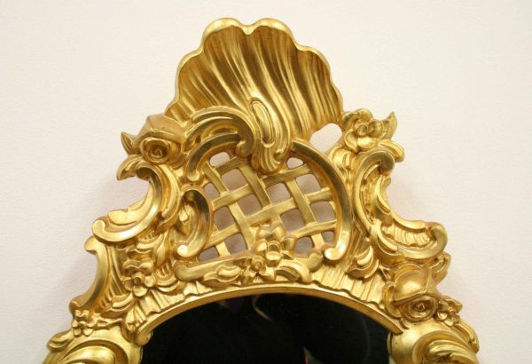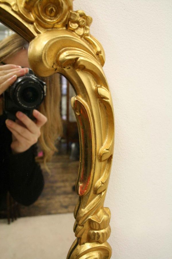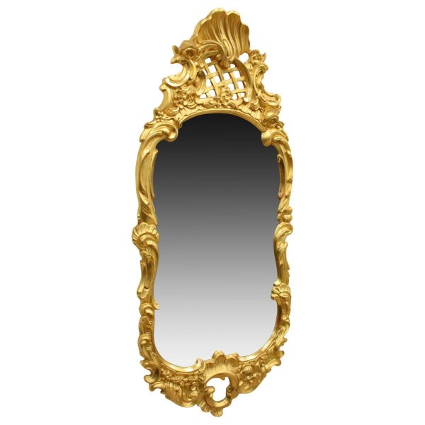 Circa 1920, very stylish Louis XVI style carved and gilded wall mirror, surmounted with a shaped shell top, open trellis and foliate Rococo carving. The mirror follows the same form as the frame. At the bottom is an open section again with Rococo carving, and foliate carving in gesso. Clean and stylish.