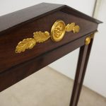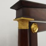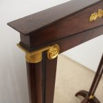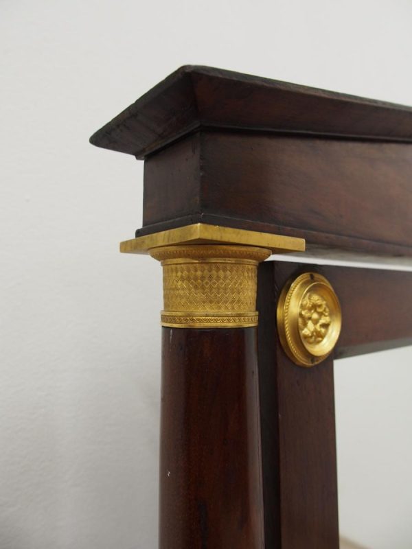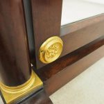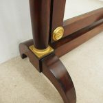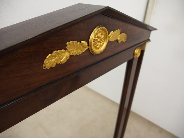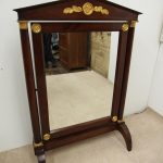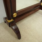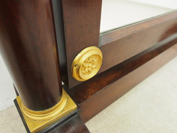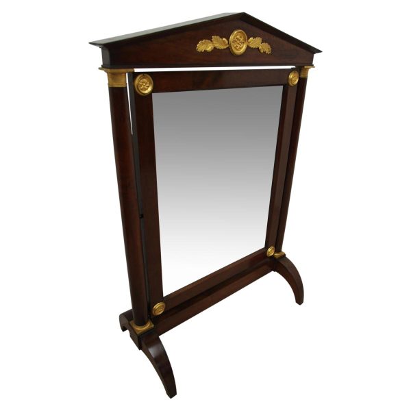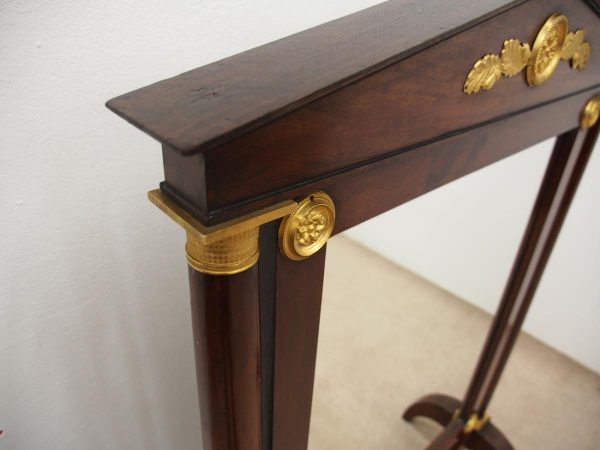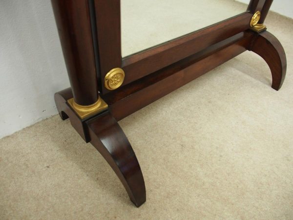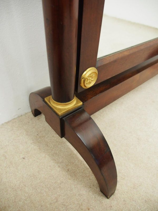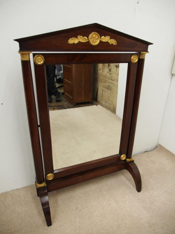 Circa 1820, unusual low Biedermeier cheval mirror. The mirror with its architectural pediment top, with a pressed ormolu centre rosette. This has foliate casting of acorns and leaves left and right. The mirror has a mahogany frame and on each corner of the frame there is a cast roundel with a flower head in the centre, and on each side is a turned and tapering column which have ormolu capitals and a small ormolu mount at the base. The mirror is held in place by a pin in the centre about half way down so that the mirror can tilt forward and backwards. Beneath the mirror there is a large mahogany block and there are 2 trestle ends with sabre legs. Stylish, unusual piece.