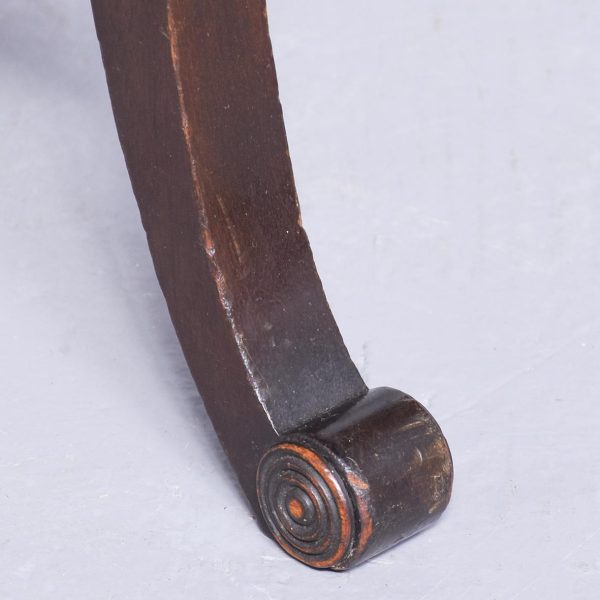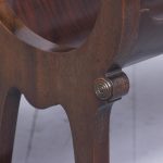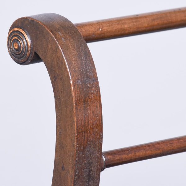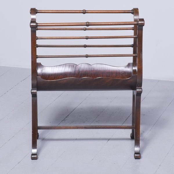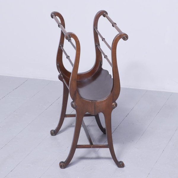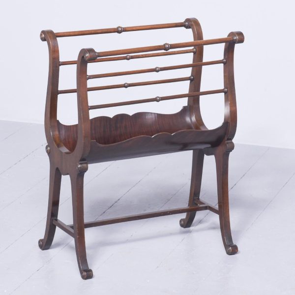 Circa 1900. An unusual and stylish lyre shaped mahogany Canterbury. The shaped and curved ends supporting turned spindles with a curved shaped base for containing magazines, with 16 carved and ribbed rondels adding style and elegance, all standing on four shaped legs finishing on a curled toe, the legs are united by a H shaped stretcher.