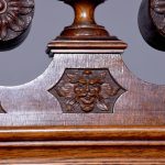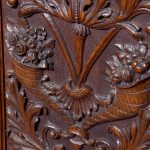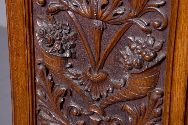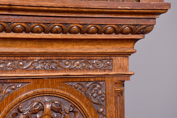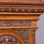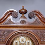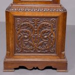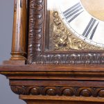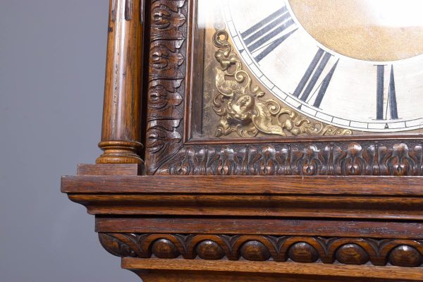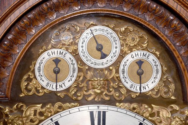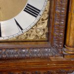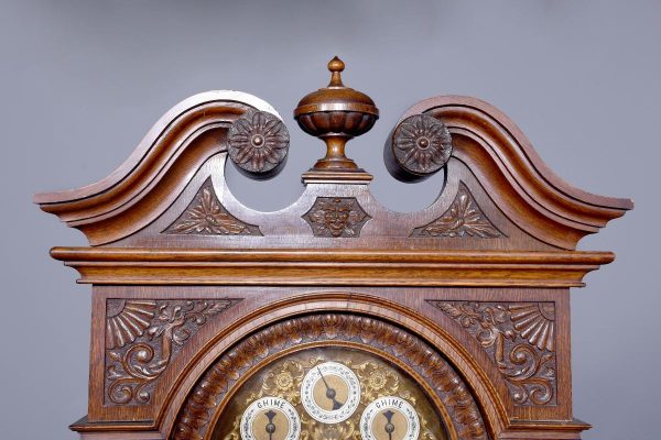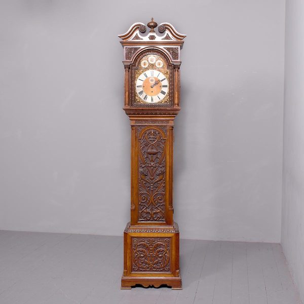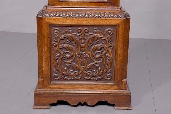 Magnificent Carved Oak Late Victorian Brass-Faced Grandfather Clock with Chimes. Surmounted byan elaborate arched pediment with carved paterae and urn, the clockface with a silvered brass facewith Roman numerals, minute hand dial and three small dials for the chimes, flanked by Corinthianpillars. The door carved with cornucopia and foliate decoration, the case with canted fluted corners above an impressive foliate-carved base on a shaped plinth. In perfect working order.