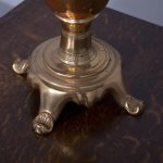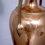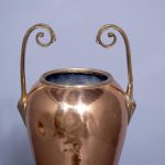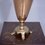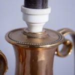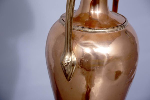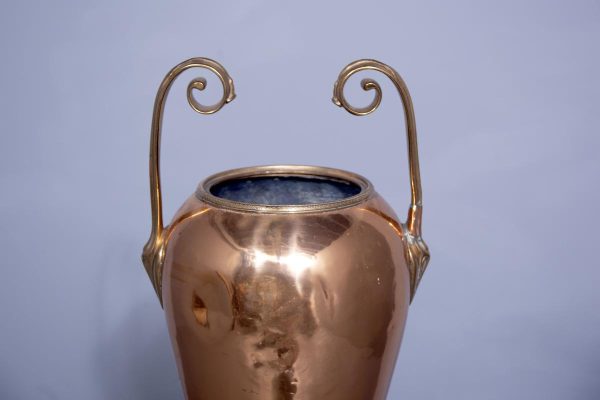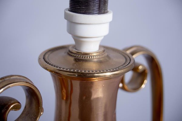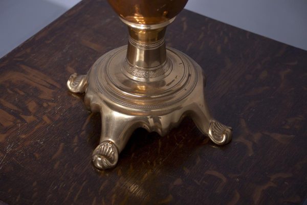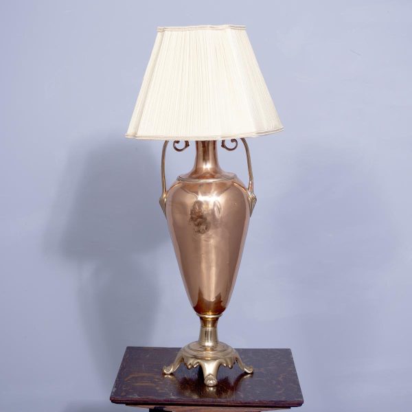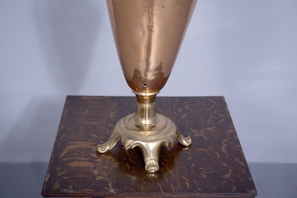 Circa 1850 (with adaptations). Magnificent copper and brass Victorian lamp from a converted Victorian urn. The tapered neck flanked by scrolling handles over the tapering bulbous copper body supported on a circular engraved brass base with four acanthus-decorated brass feet. Recently rewired with a coloured cord and with a new electrical fitting.