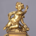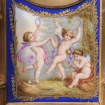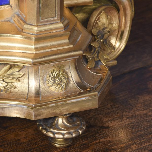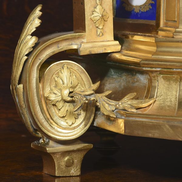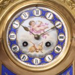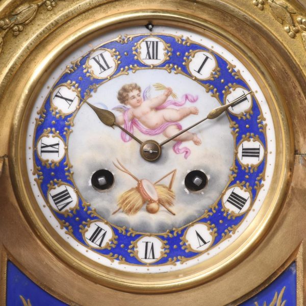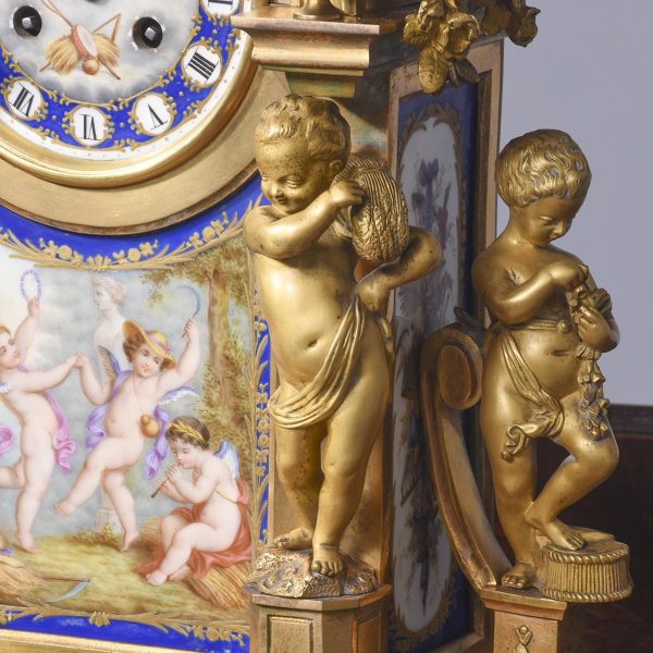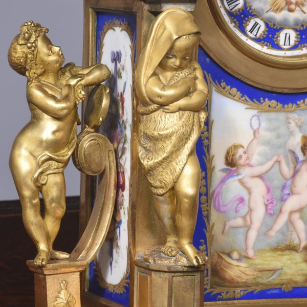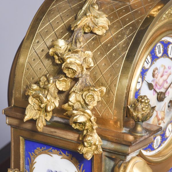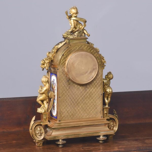 Circa 1870. A magnificent large French gilt bronze and porcelain mantel clock. The domed top surmounted by a cherub on a small platform with foliate castings trailing down each side. The circular dial painted with a flying winged cherub, beneath this a large painted panel with more cherubs, the sides with painted panels, too. The base with foliate casting and a concave section, scrolling rococo patterns on the side, resting on cast feet, the 8-day movement striking on the half hour and hour.