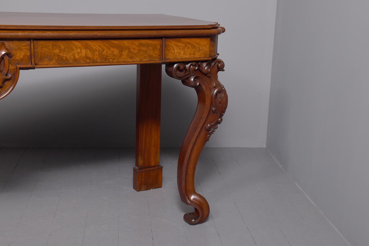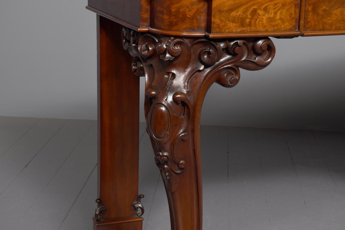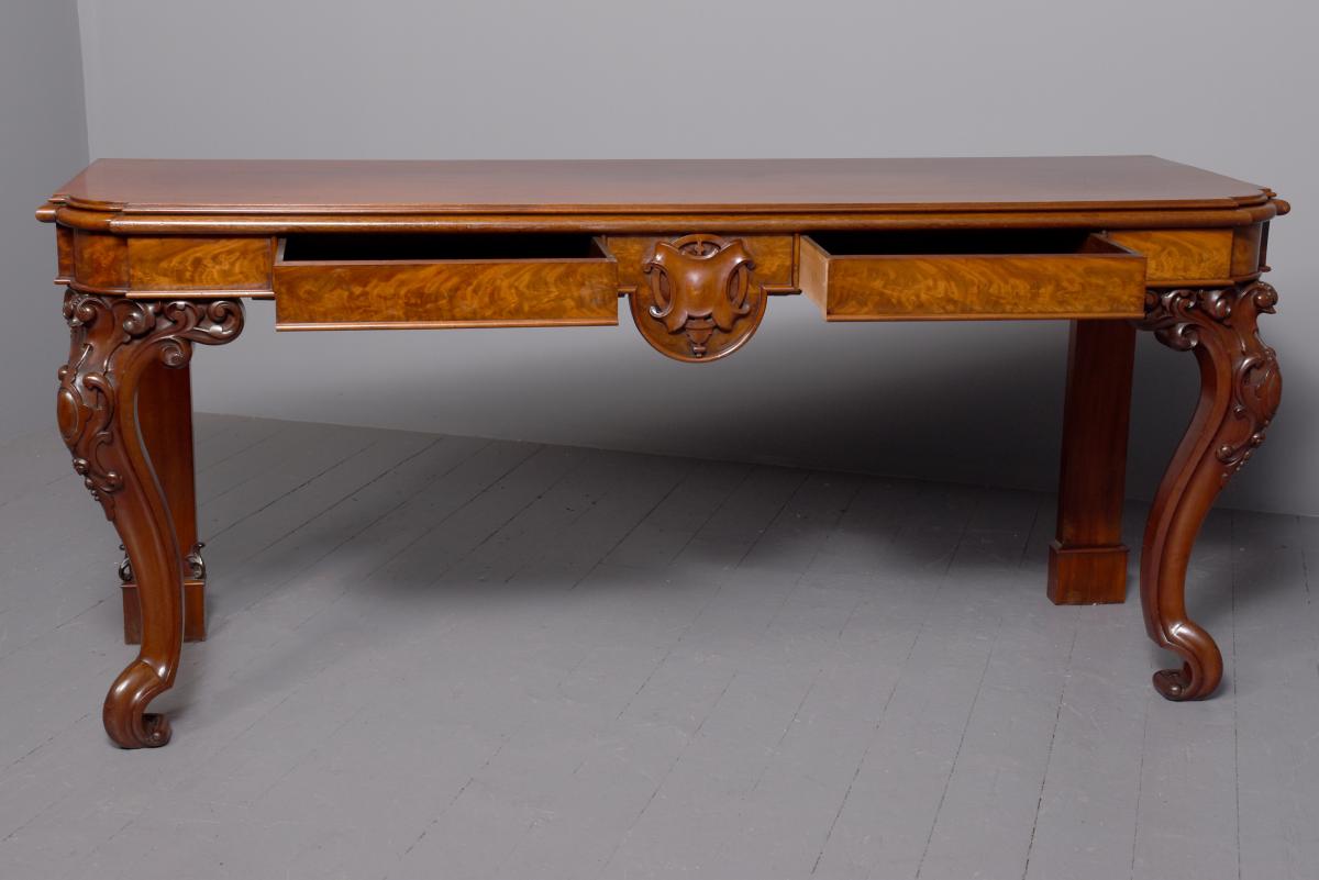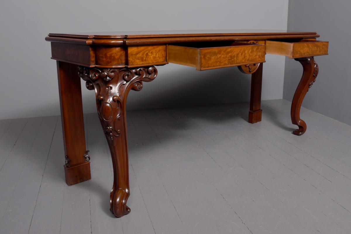 Circa 1840. Magnificent George IV carved mahogany hall or serving table. The rectangular top with shaped corners and stepped, moulded fore-edges above a flame mahogany frieze with two frieze drawers and a central carved cartouche. Supported on magnificent front cabriole legs with foliate quarter brackets and rococo C scroll carved knees over fluted scroll feet. In pristine condition.