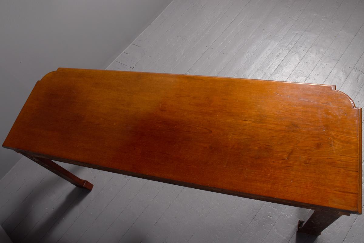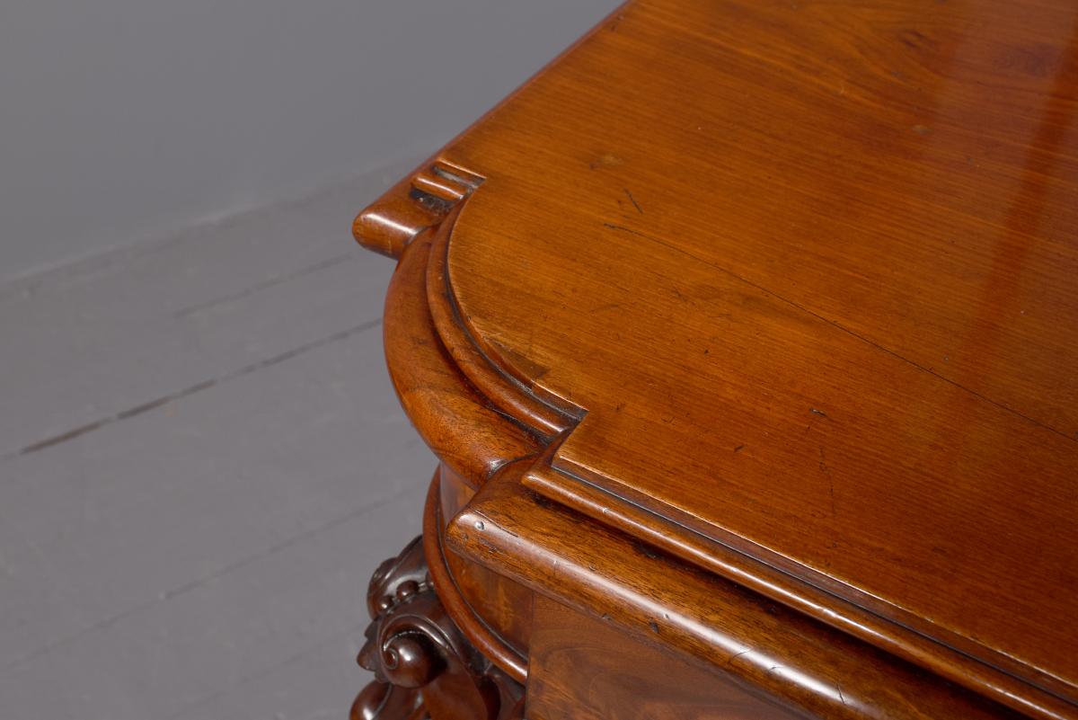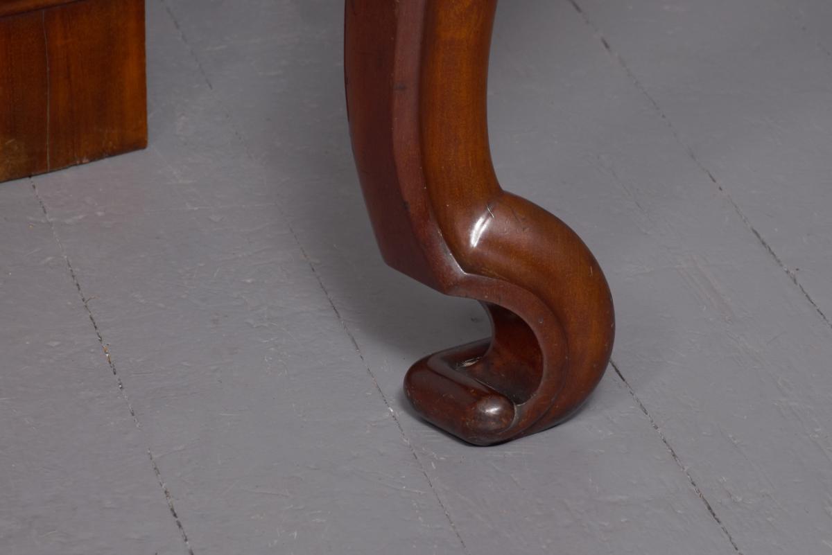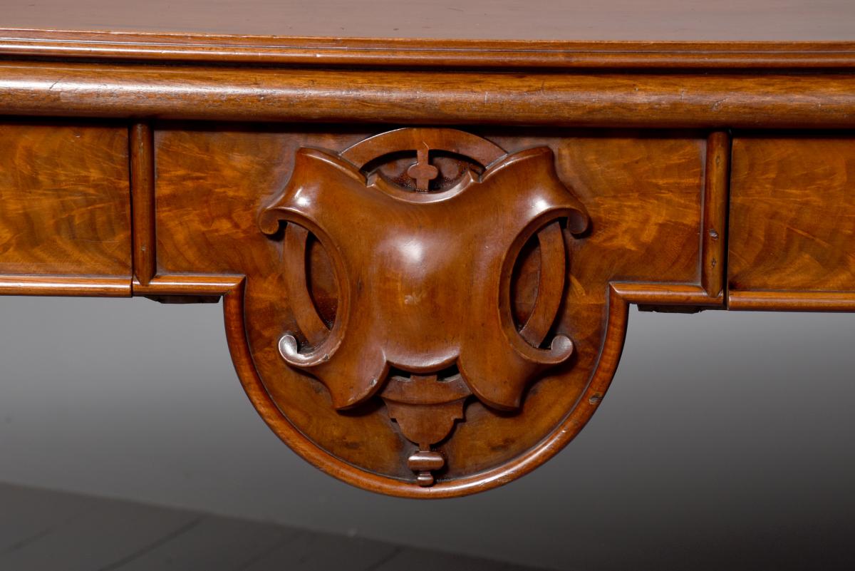 Circa 1840. Magnificent George IV carved mahogany hall or serving table. The rectangular top with shaped corners and stepped, moulded fore-edges above a flame mahogany frieze with two frieze drawers and a central carved cartouche. Supported on magnificent front cabriole legs with foliate quarter brackets and rococo C scroll carved knees over fluted scroll feet. In pristine condition.