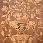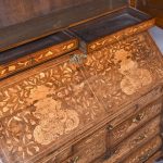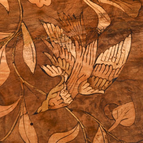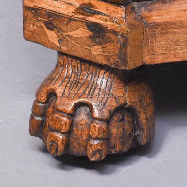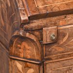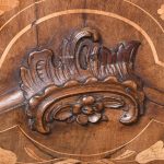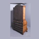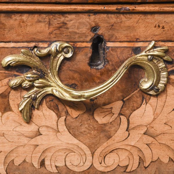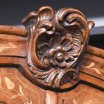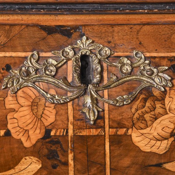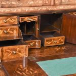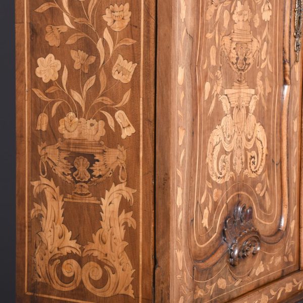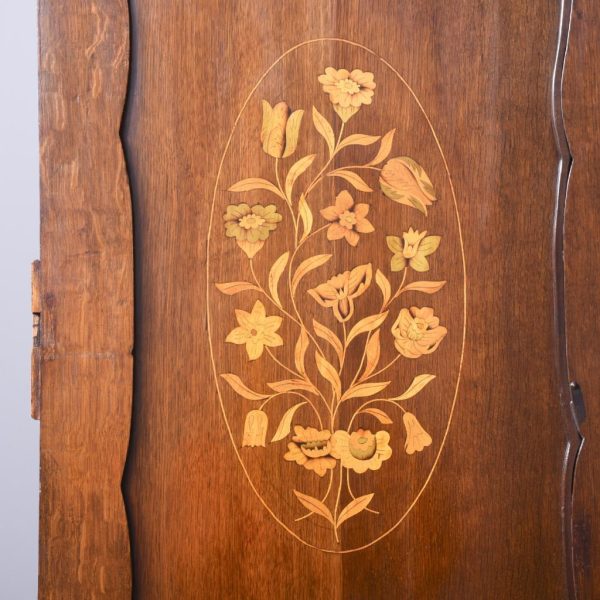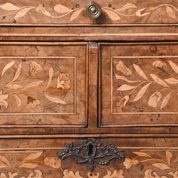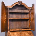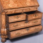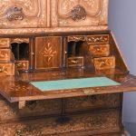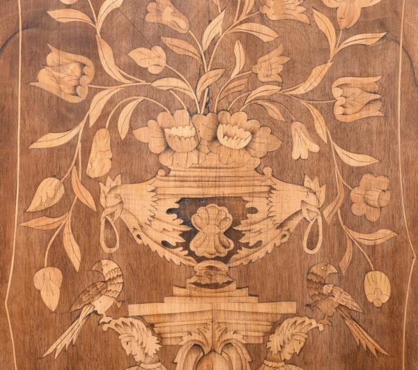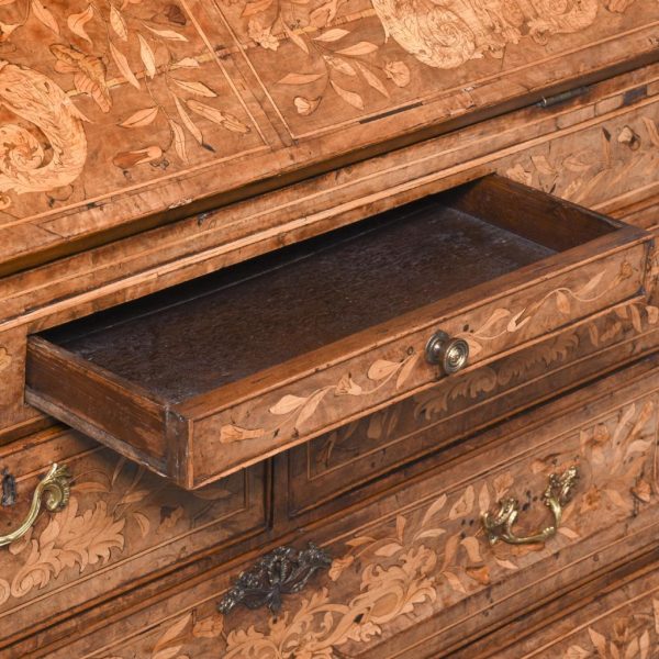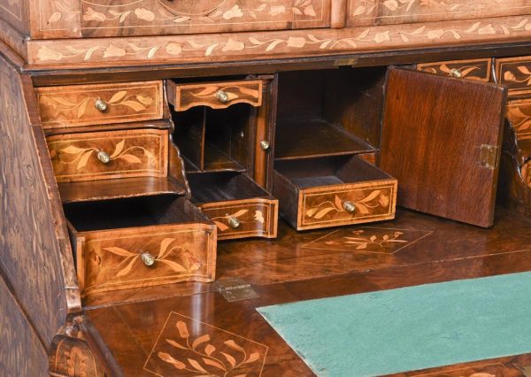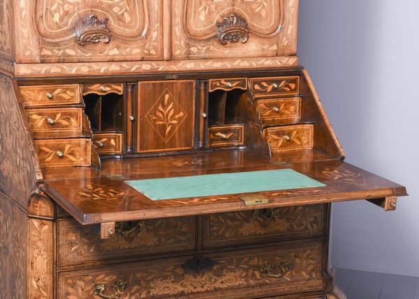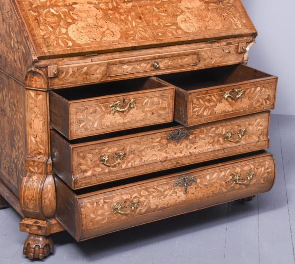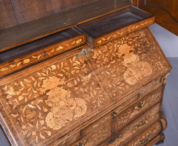 Circa 1800. Magnificent marquetry inlaid Dutch bureau bookcase. Surmounted by an arched cornice with centrally foliate carved crest, the two shaped door with elaborate marquetry decoration in exotic woods including neoclassical urns, flowers, and birds. The inside of the doors with further panels of marquetry opening to the interior with bookshelves and marquetry-inlaid drawers to the base. The bureau with elaborate matching marquetry inlay to the flap and with rococo brass escutcheon. The interior with stepped drawers, pigeonholes, secret compartments and marquetry inlaid writing flap. With one shallow frieze drawer above two short drawers and two bombe-front drawers all in marquetry with Rococo brass hardware and flanked by canted bombe corners, all above a short marquetry skirt supported on deeply carved ball and claw feet in front and rectangular rear supports.