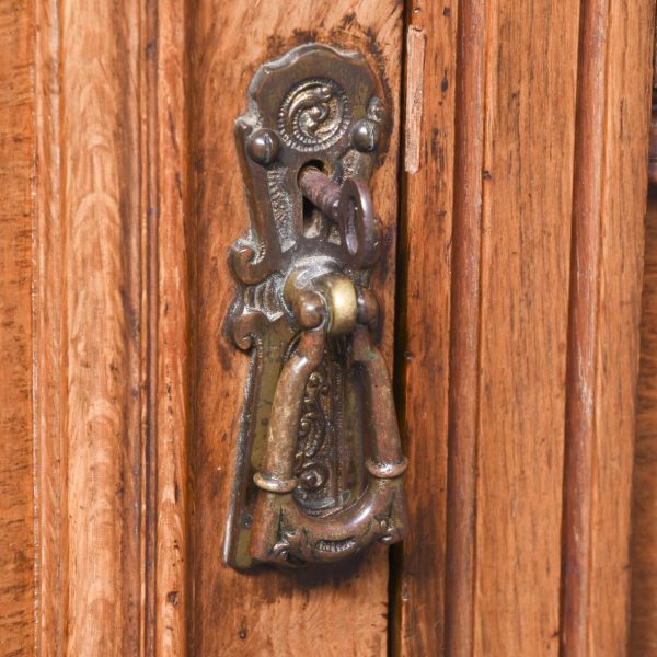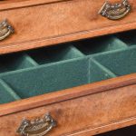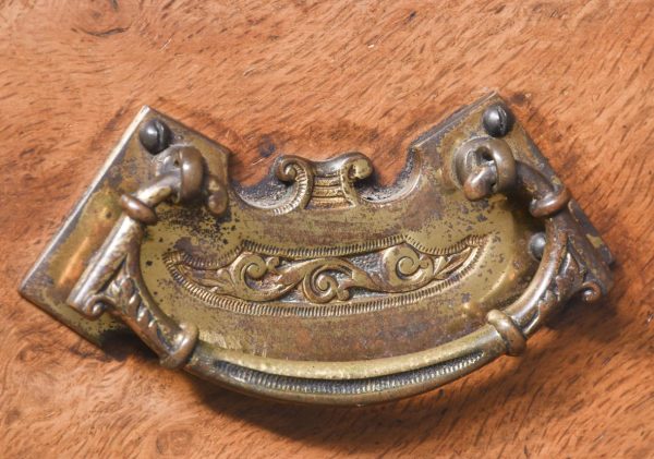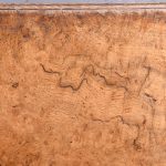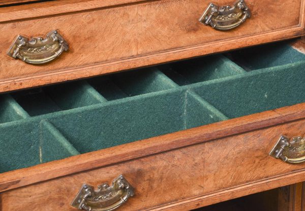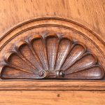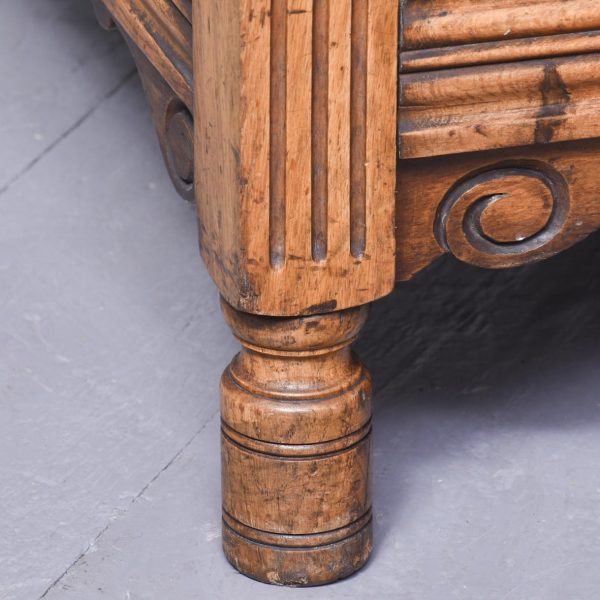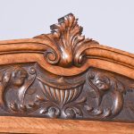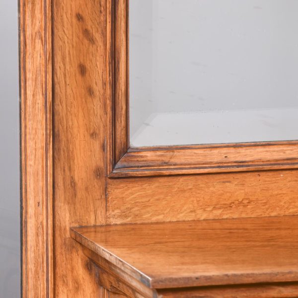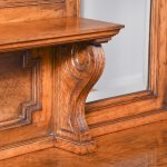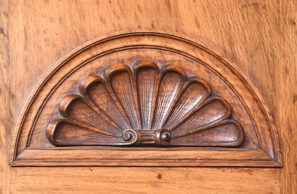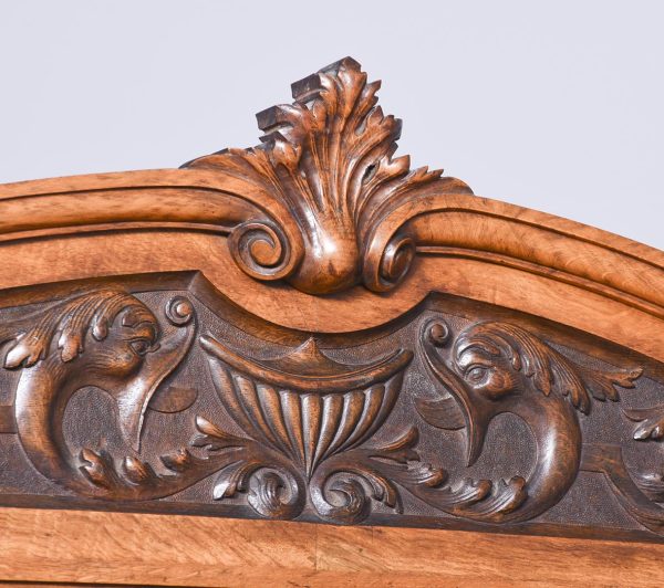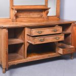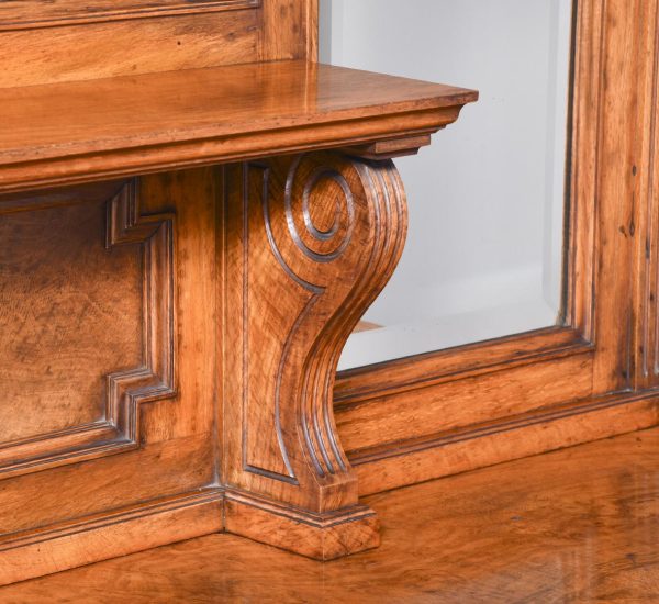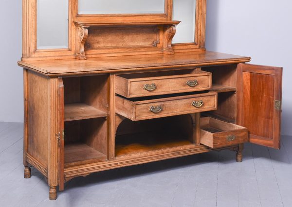 Circa 1880. Magnificent Victorian pollard oak mirror-backed sideboard. Surmounted by a pediment with finely carved acanthus leaves and neo-classical scrolls, the back with three beveled mirrors in perfect condition, carved shell decoration and central shelf on fluted supports. The sideboard top in quartered, mirror-matched burr oak above two drawers with moulded rims and cast brass handles over open shelf flanked by two shelved cupboards,s. All on a neat moulded base over turned feet.