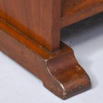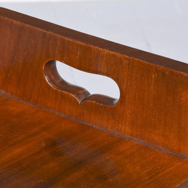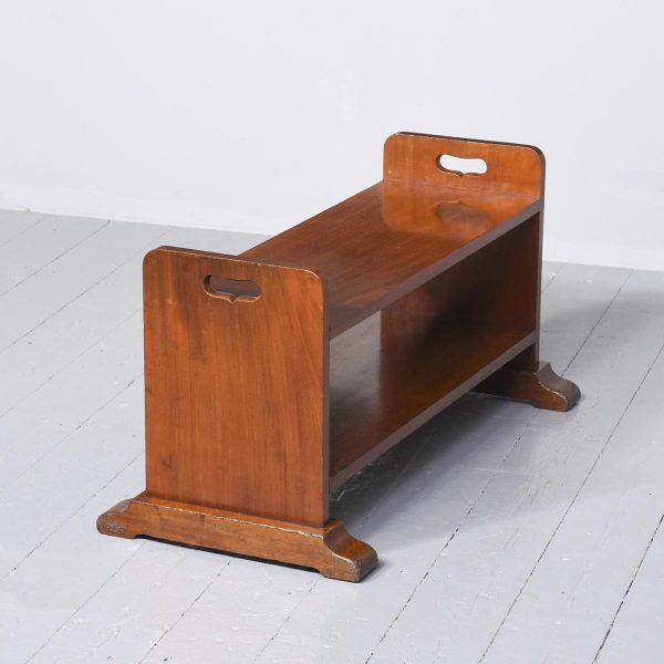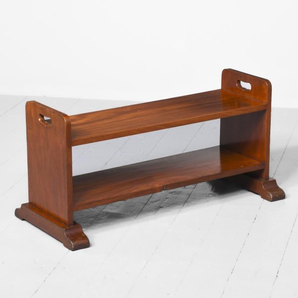 Circa 1900. An unusual mahogany two tier bench with a rectangular solid top, with shelf beneath, two raised ends with pierced stylish lifting handles. The whole piece rests on two squat trestle ends which sit low to the floor, polished on all sides, making it free standing.
