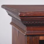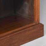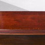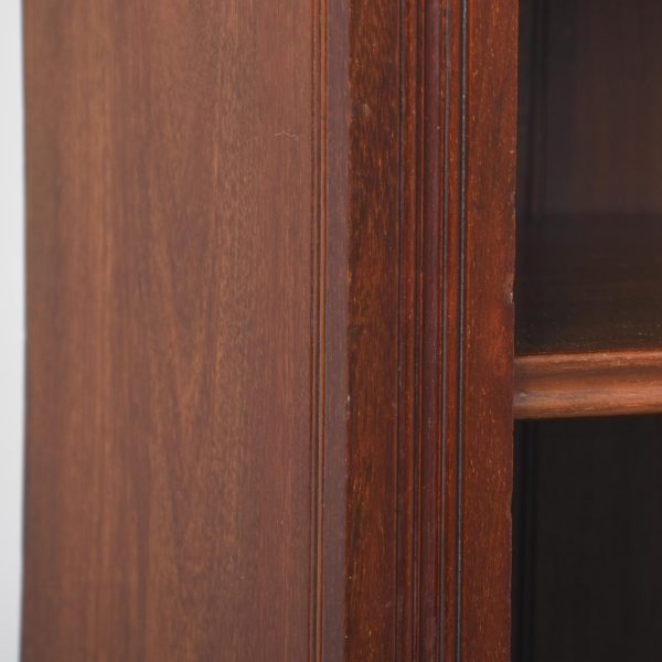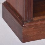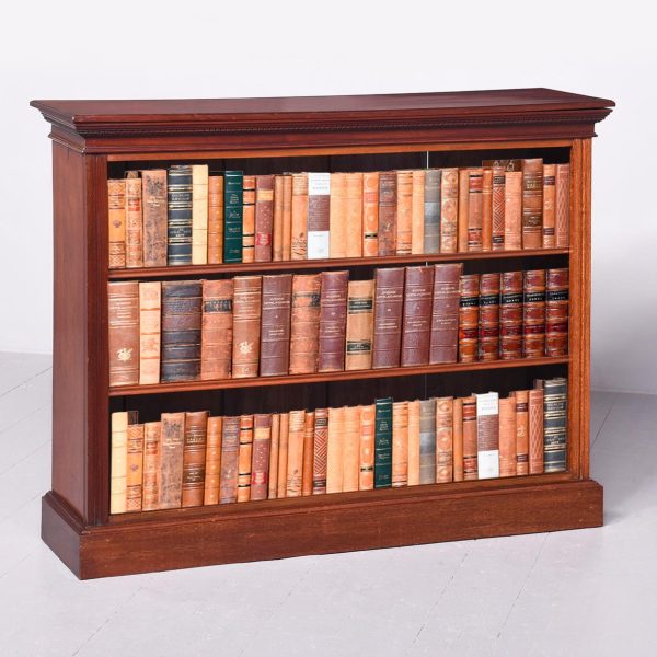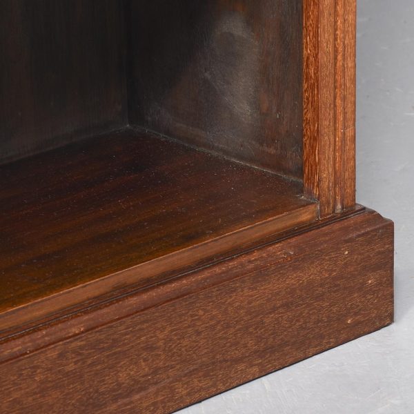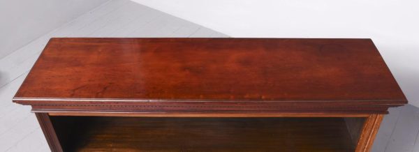 Circa 1900. A neat size Georgian style mahogany open bookcase, the top with rich flame mahogany, with moulded fore-edge, frieze with dentilled detail, with 2 solid shelves with moulded facing, with ribbed fore-edges, beneath the bottom shelf there is a moulding and the whole piece rests on an enclosed plinth.