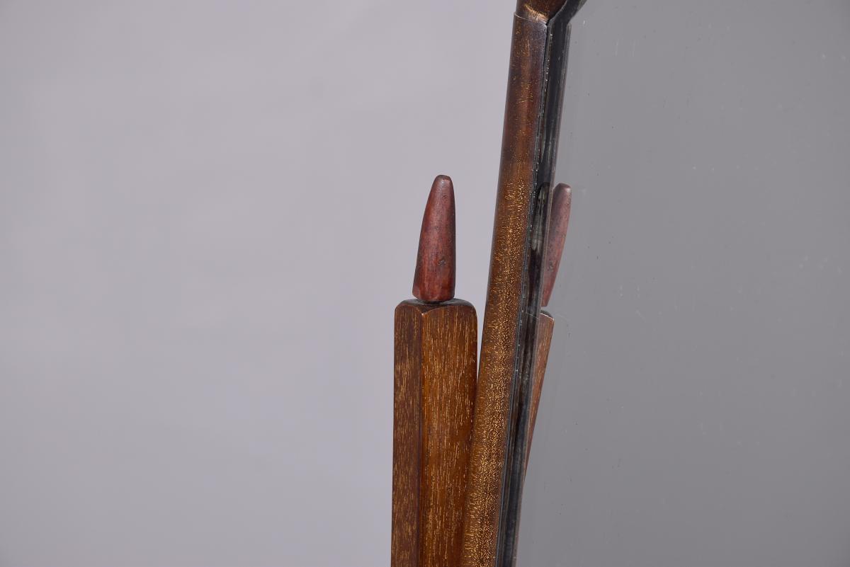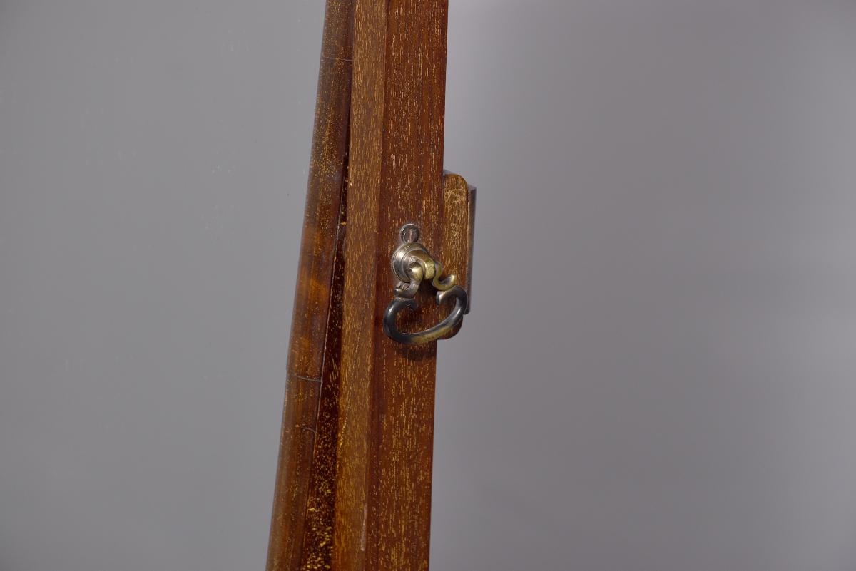 Circa 1930s. A Queen Anne style mahogany framed cheval mirror, the stylish shaped frame with rounded fore-edge, the mirror held in place by two tapering uprights surmounted by very elegant urn shaped finials, the frame held in position by a pair of cast brass axe-head drops, beneath the mirror is a shaped stretcher bracing the two uprights, all resting on four downward facing cabriole legs.