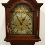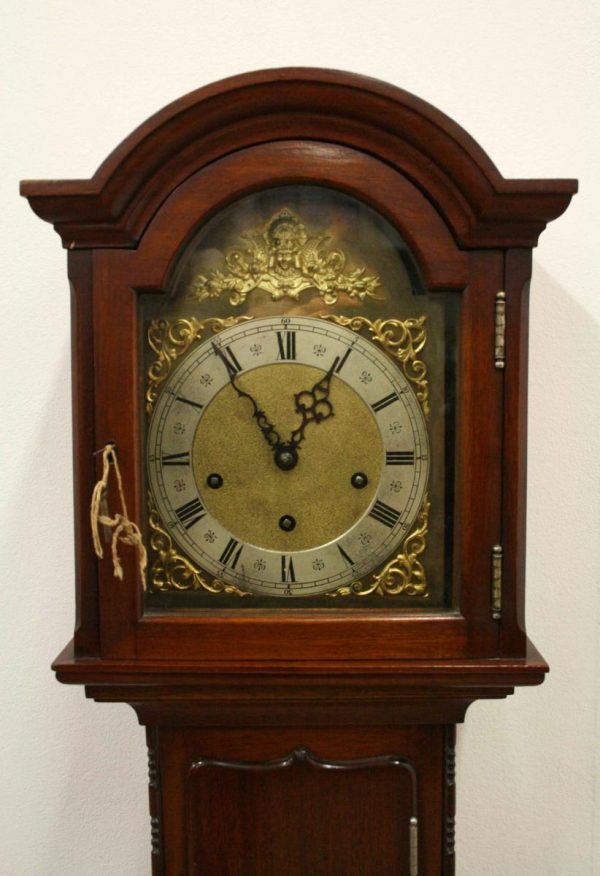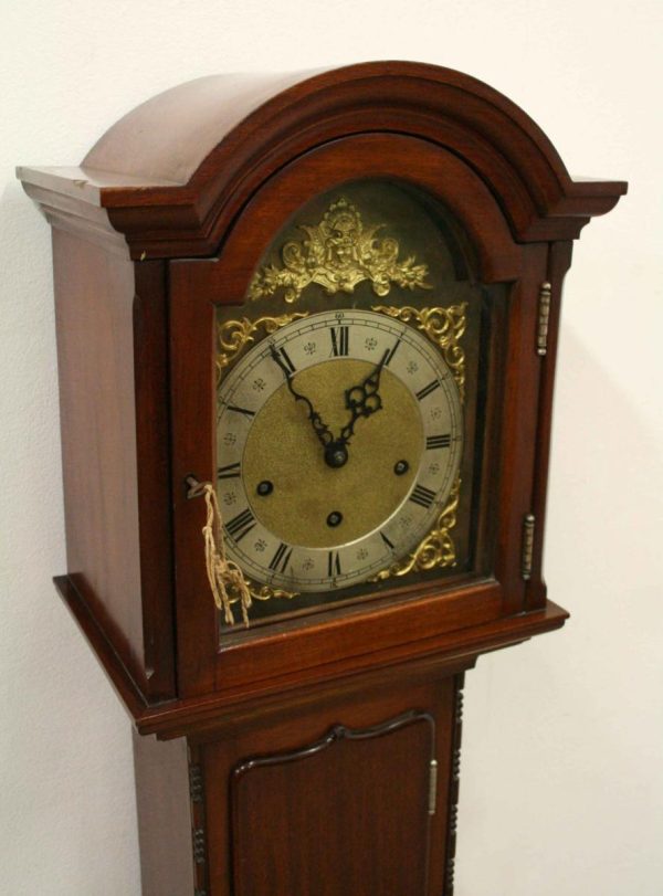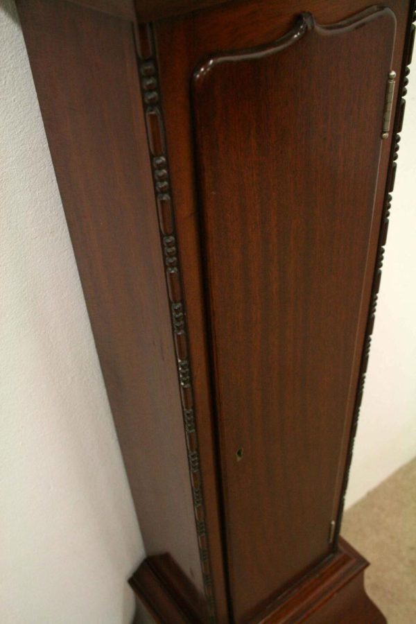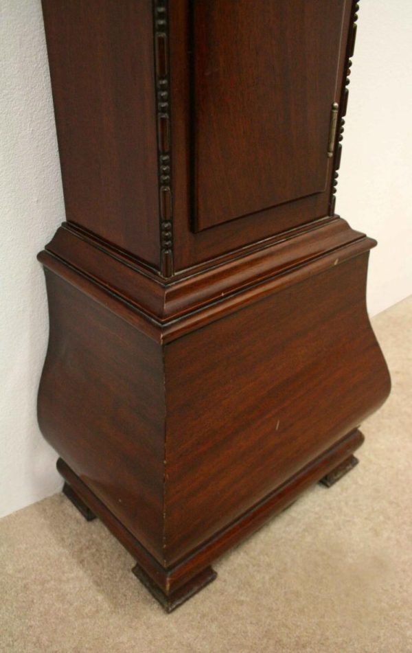 Circa 1920, mahogany Grandmother clock.  The arched hood has a glazed door, brass movement with silvered face and brass bezel. Below this is a full length door with a stylish shaped top and silver hinges. The fore-edge of the case on each side of the door has egg and dart beading. Beneath the door there is a double ogee moulding and the base of the clock is bombe shaped, with a stylish apron and ogee bracket feet. The clock with its 3 winding holes indicating time keeper, striking on the hour and musical and the tune is a Westminster tune. The clock runs for 8 days. This price includes the clock being serviced.