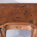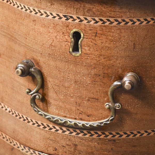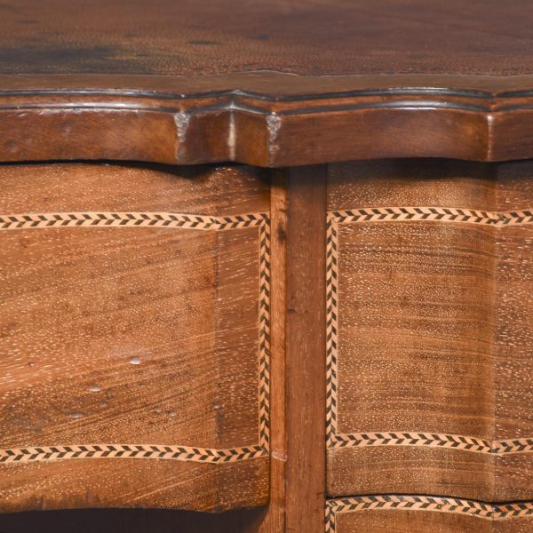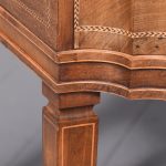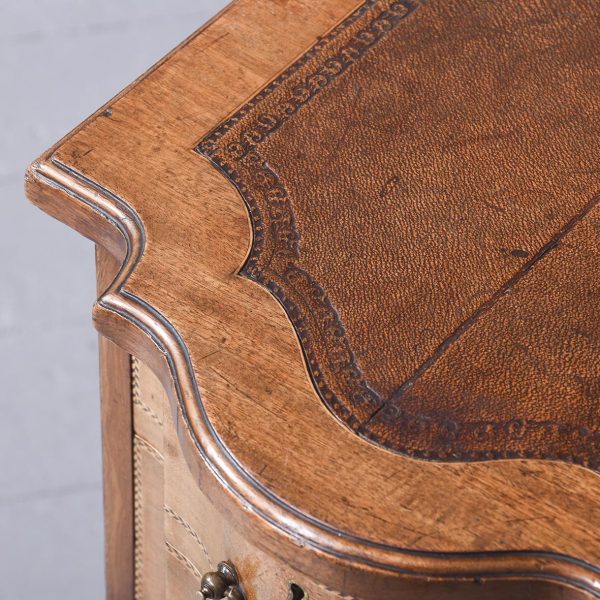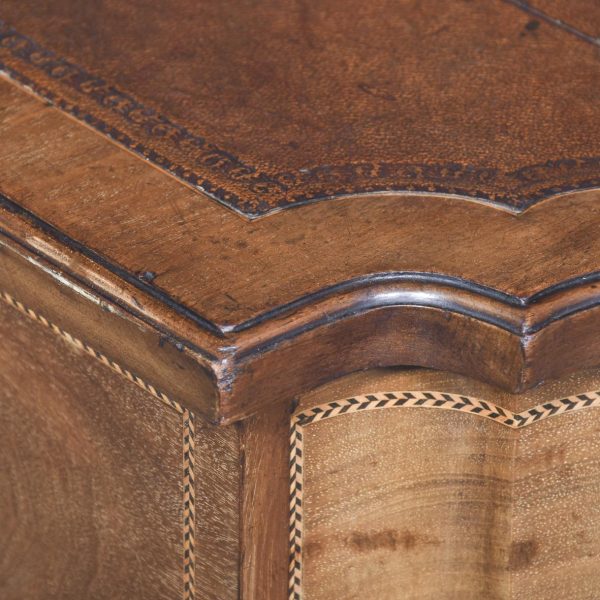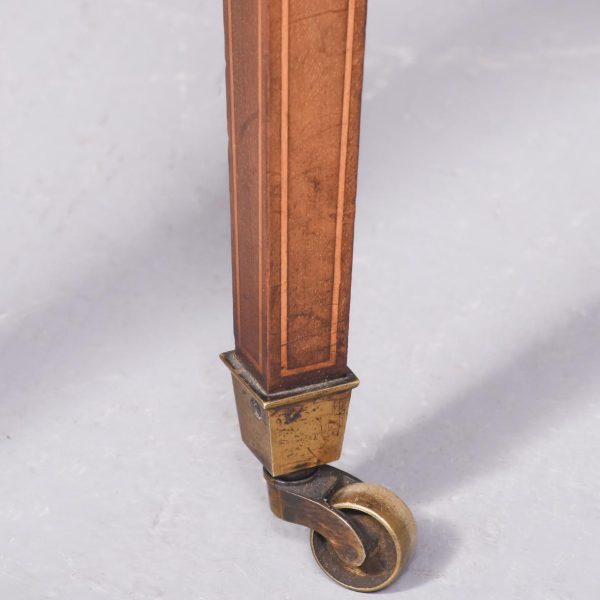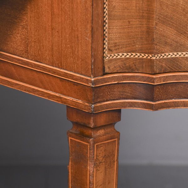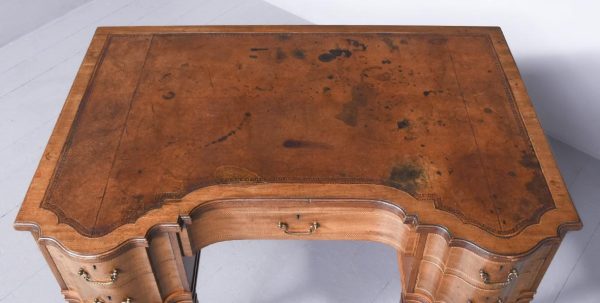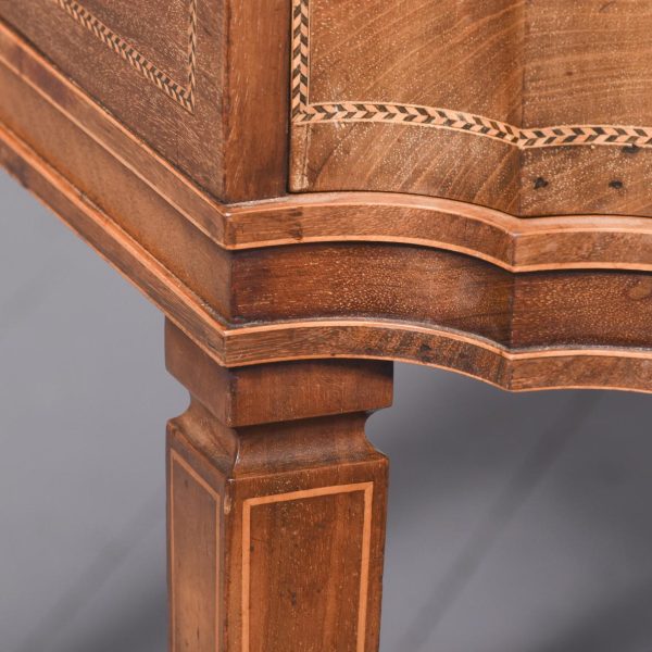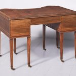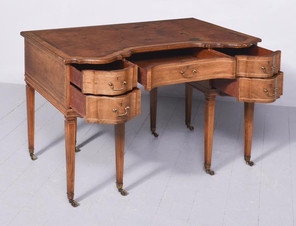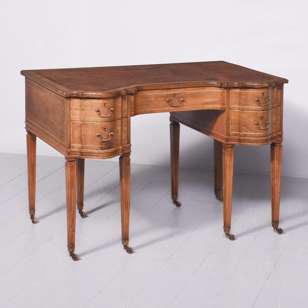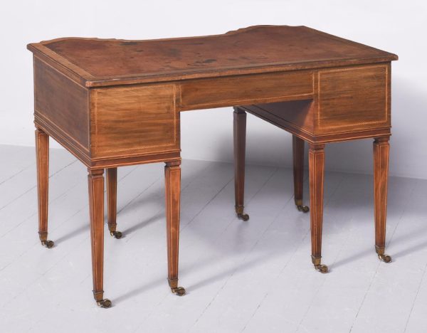 Circa 1900, Edwardian mahogany Sheraton revival desk. With original leather top, boxwood banding and mahogany frame. There is a single drawer in the centre which follows the form of the top, with concave ends. There are 2 drawers either side with shaped fronts and chevron inlay, and they have Georgian style brass gilded swan neck handles. The back is polished and free standing, and the tapering legs have string inlay, brass cups and castors.