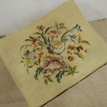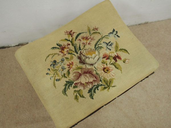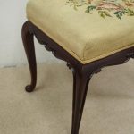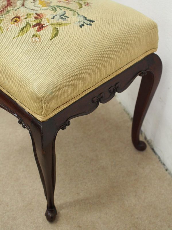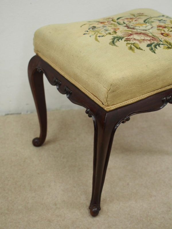 Circa 1900, mahogany framed stool with hand embroidered gros point tapestry top. It has shaped rails with C scroll decorations, and is all standing on cabriole supports.