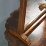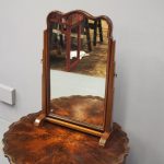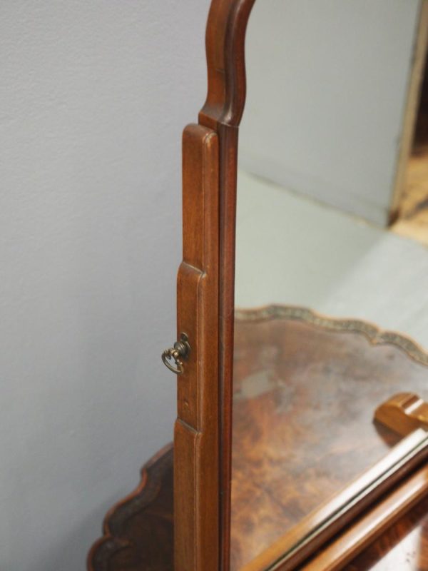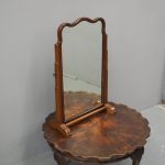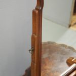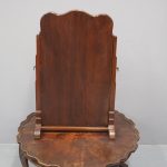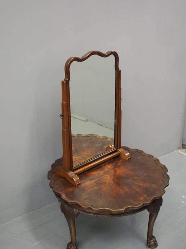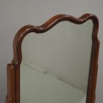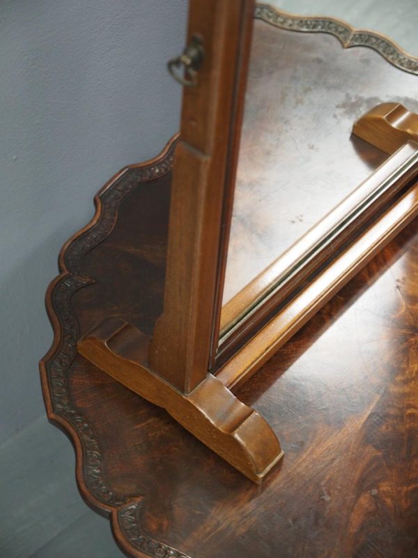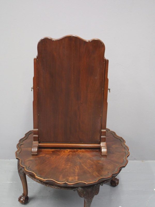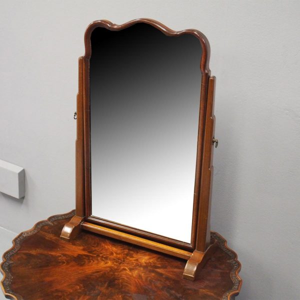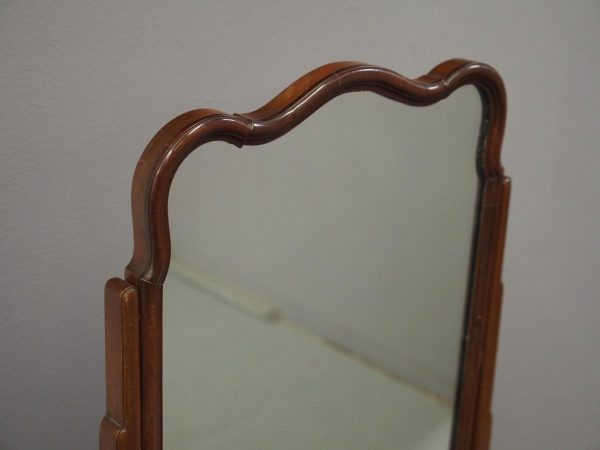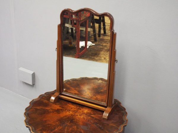 Circa 1920, mahogany framed toilet mirror by Whytock & Reid of Edinburgh. With Queen Anne style shaped frame, moulded facing and held in place by stepped uprights and cast brass axe head drops. The base has 2 crossover stretchers with a reeded edge and stands on squat, Lorimer style feet with slight central raised section. It has its original glass.
