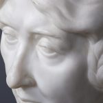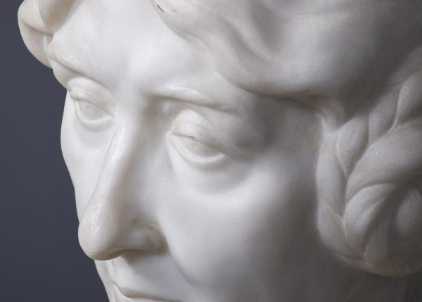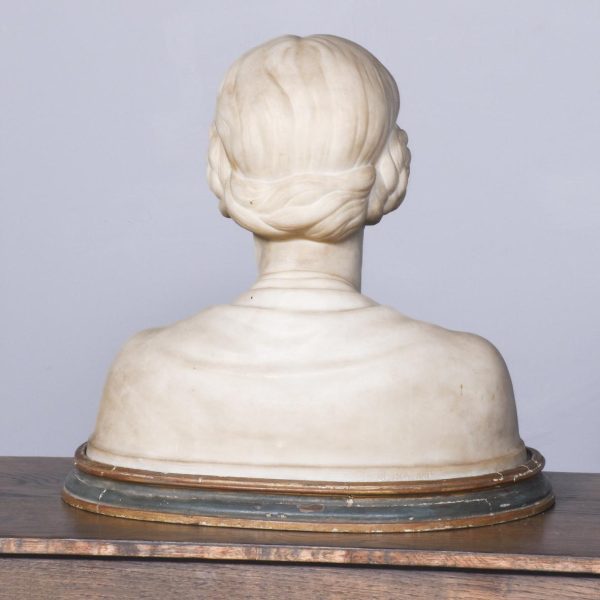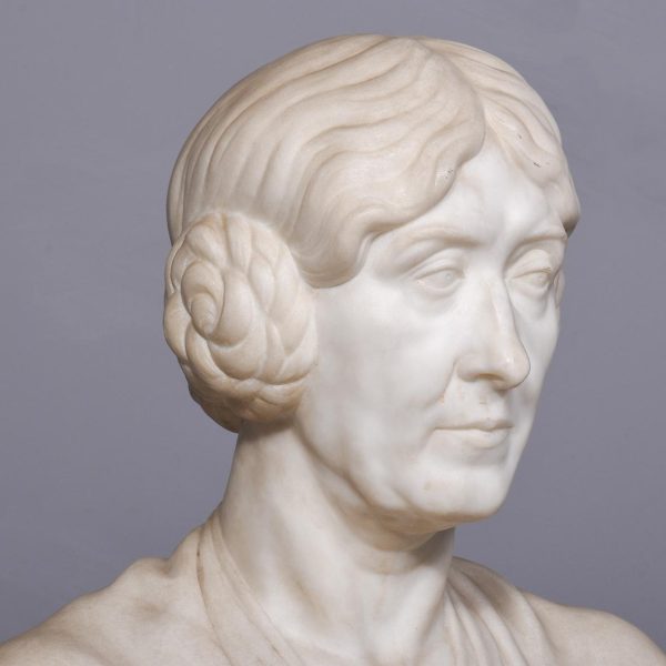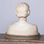 Circa 1900 A stylish carved white marble bust of a lady, the back of the bust is signed, ‘F. Sargant ‘ the lady has a hairstyle typical of the period, the head and the shoulders with gown draped over the shoulders, good colour and patination.