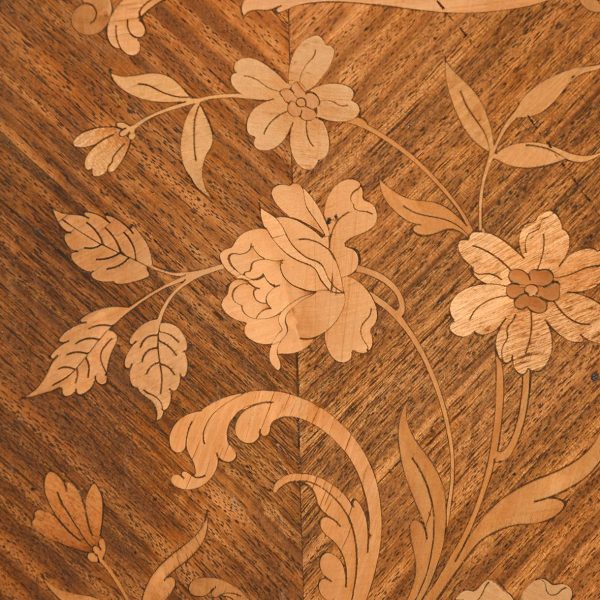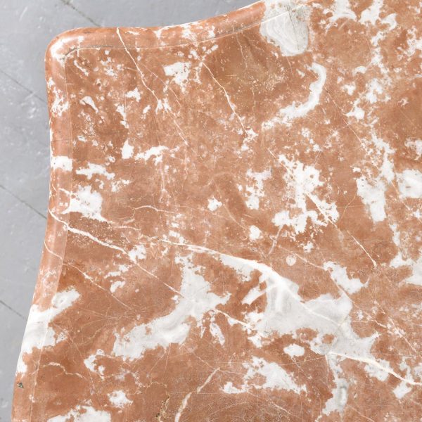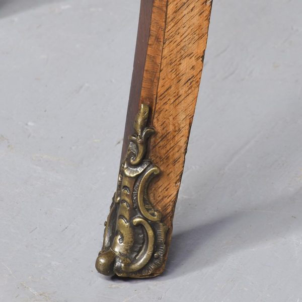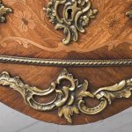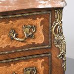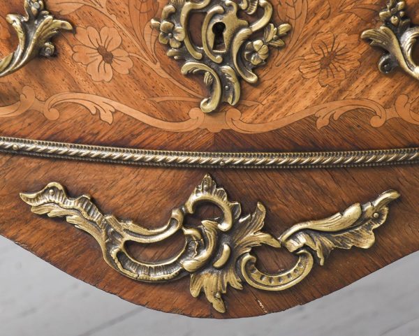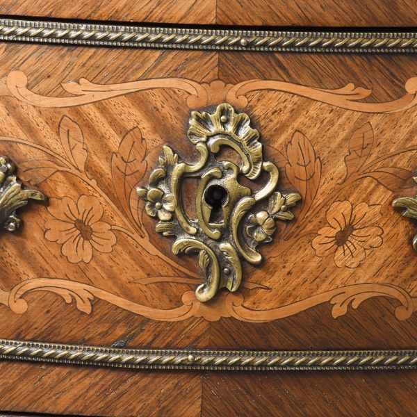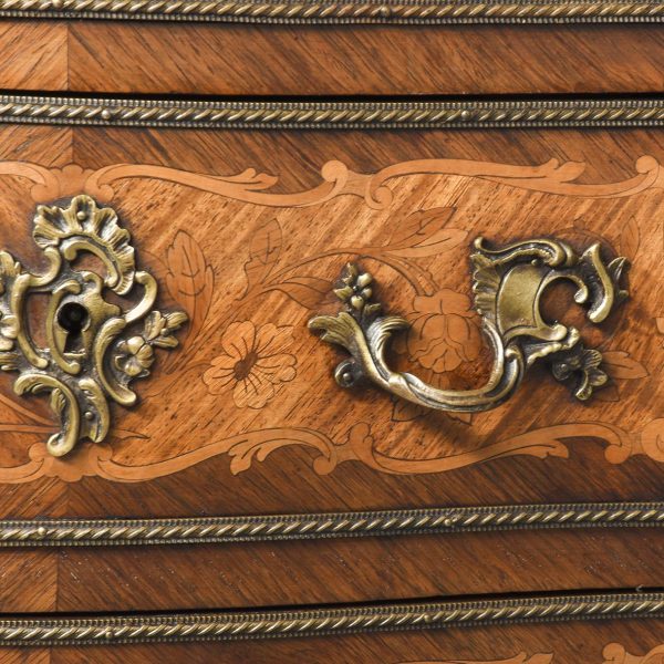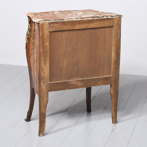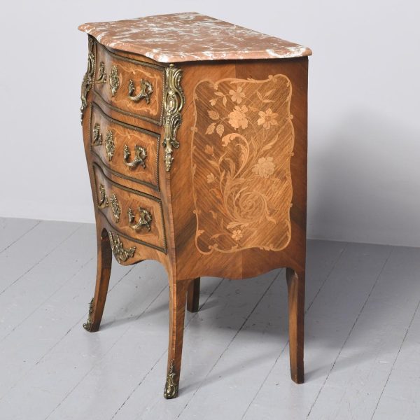 Circa 1900. A neat sized marble topped ormolu mounted and marquetry French commode, with shaped top in pink variegated marble with moulded fore edge. With a configuration of three shaped, inlaid drawers with a fine beading, rococo handles and exuberant pierced escutcheons, laid on a marquetry panel. The serpentine and bombe shaped sides have a large marquetry panels. Below the bottom drawer is a shaped frieze and a further gilded mount, resting on square and slightly out swept back legs, with cabriole legs with cast and pierced ormolu blocks on the top, chamfered fore edge and finishing on a pair of well-cast sabots to the front.