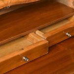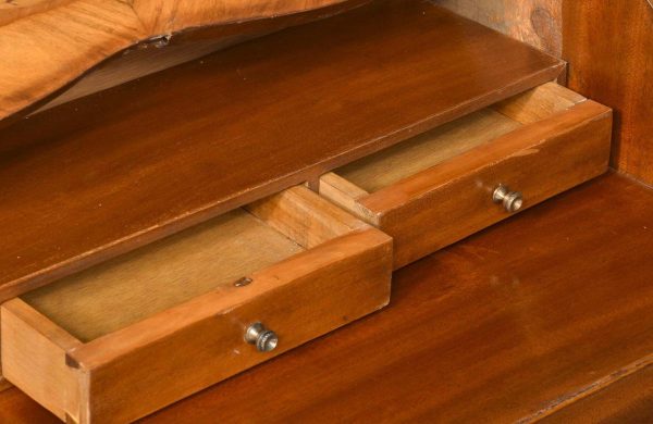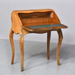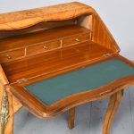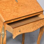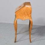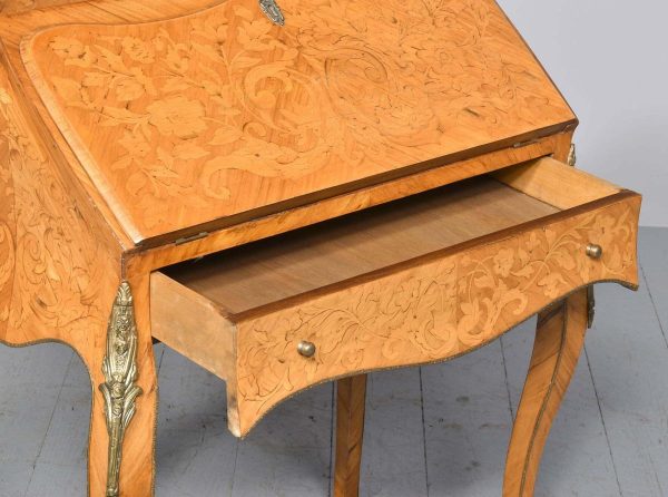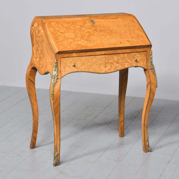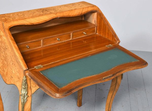 Circa 1960. Marquetry inlaid walnut French ladies writing bureau. The top in mirror matched walnut with intricate foliate inlay over a shaped flap with matching marquetry inlay, opening to interior with embossed writing surface and drawers. With a shaped frieze drawer with brass handles and supported on cabriole legs with brass mounts and sabots. Attractive and decorative item.