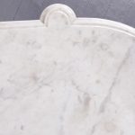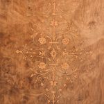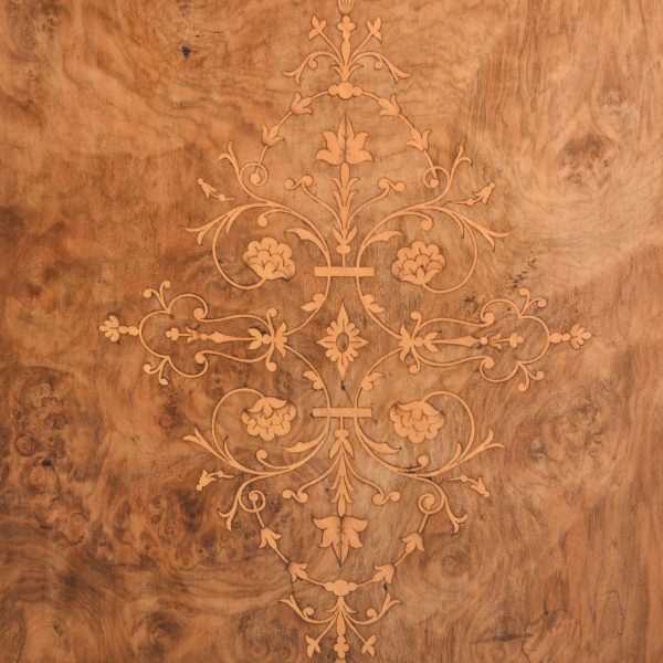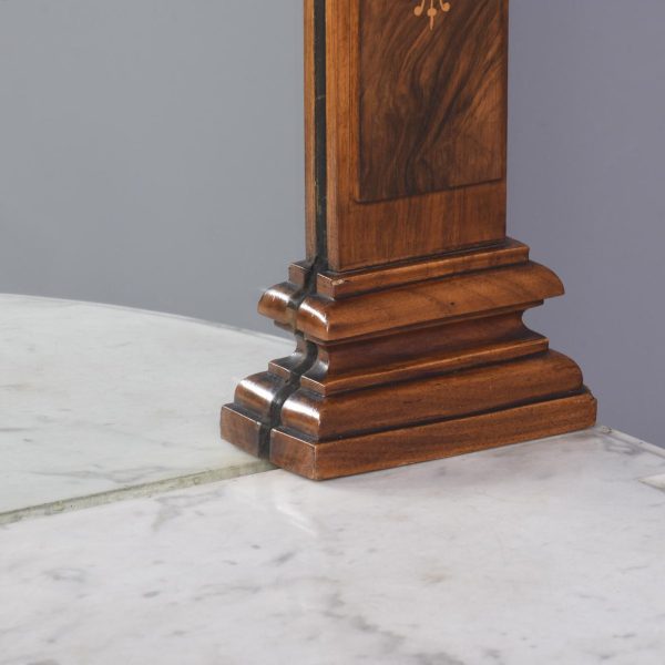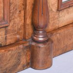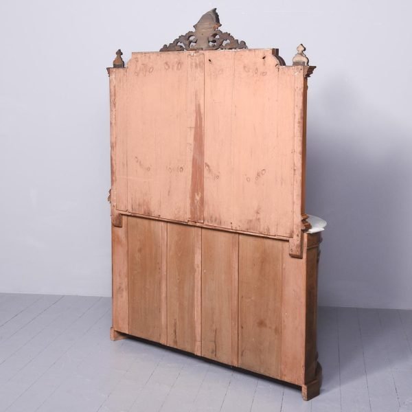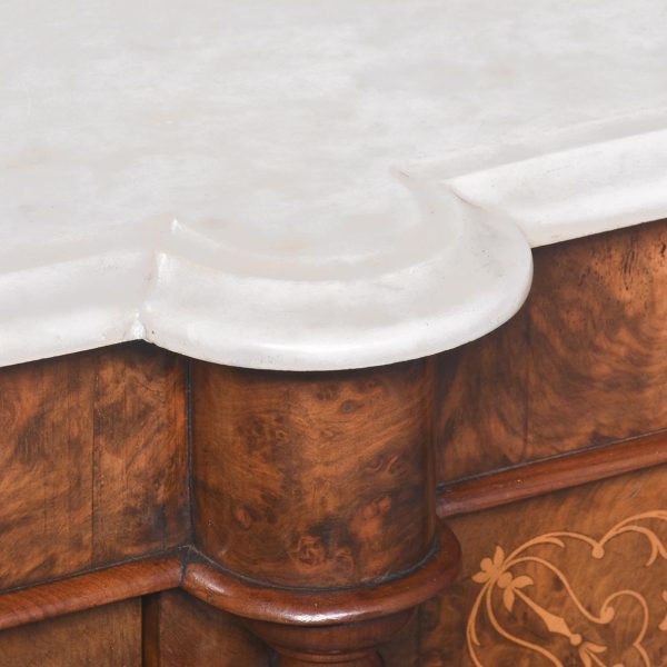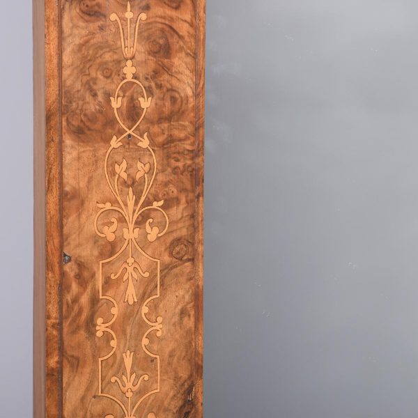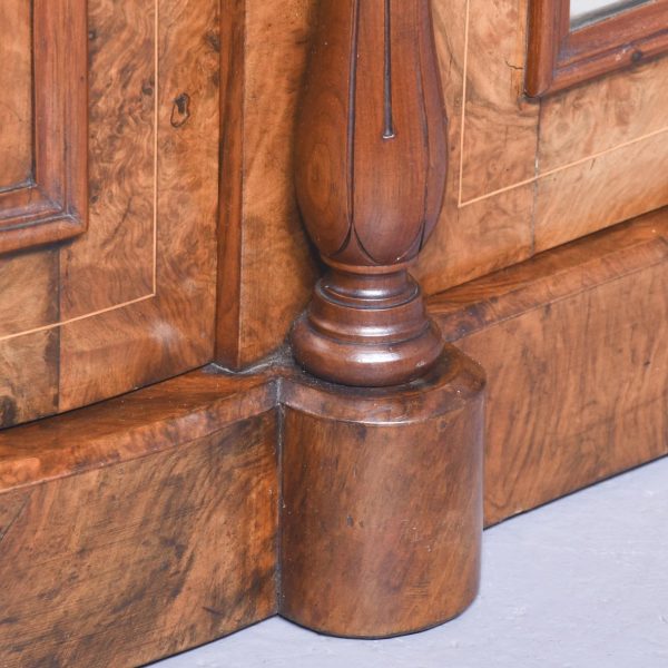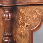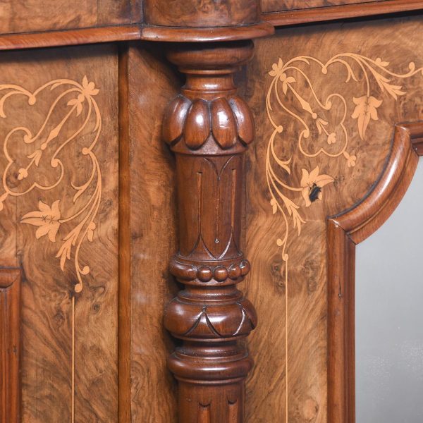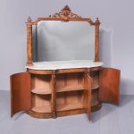 Circa 1870. Quality Arabesque marquetry inlaid marble-top mirror-back Victorian sideboard/credenza. The rectangular mirror-back with boxwood marquetry inlay, shaped corners surmounted by an open carved foliate pediment. The shaped veined grey marble top with outset corners over a central mirror door flanked by carved tapering columns and bow-front side doors opening to shelved cupboards, all above an enclosed plinth base. Was £4250, now £2950 sale price.
