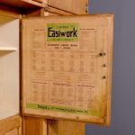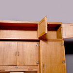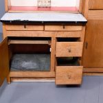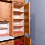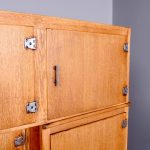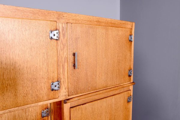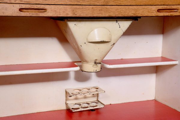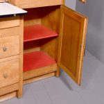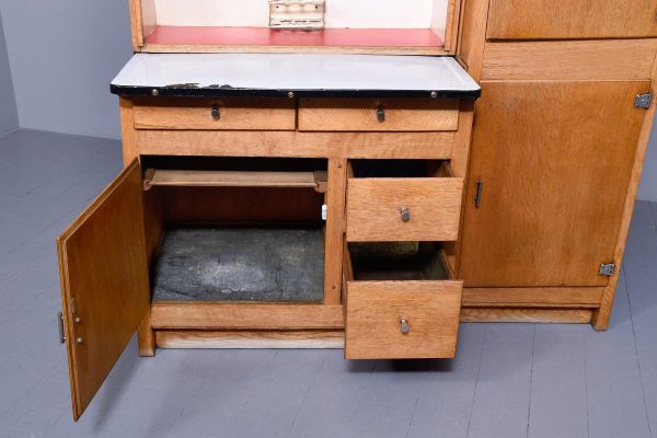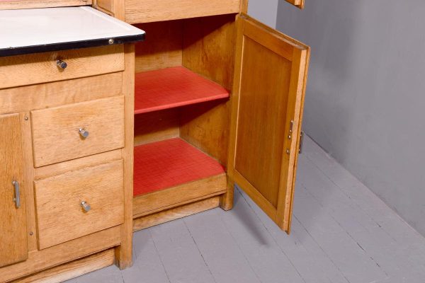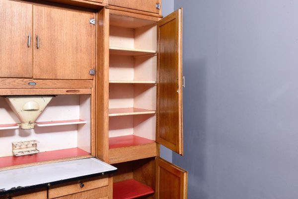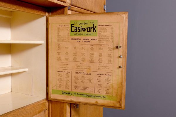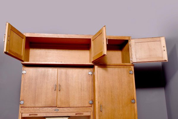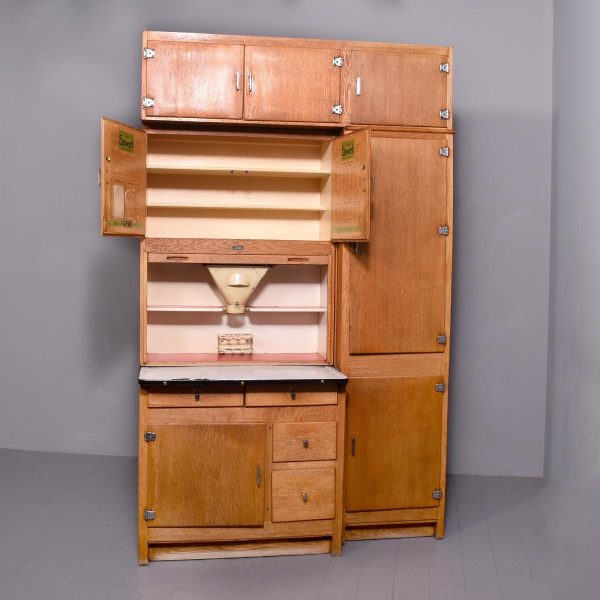 A massive oak Easiwork kitchen cabinet from the1930’s, the cabinet which comes in 4sections, with cupboards, drawers and tambour front, the main centered section with two pairs of cupboards, the lower ones with information on the inside ‘Easiwork Limited 242Tottenham Court Road, London, with ideas for food and for notes on each side, beneath this there is a tambour section which opens to reveal a flour dispenser, egg holder with enamel top protruding with drawers and cupboards below, left and right, this massive cabinet is in excellent condition, and vert rare.